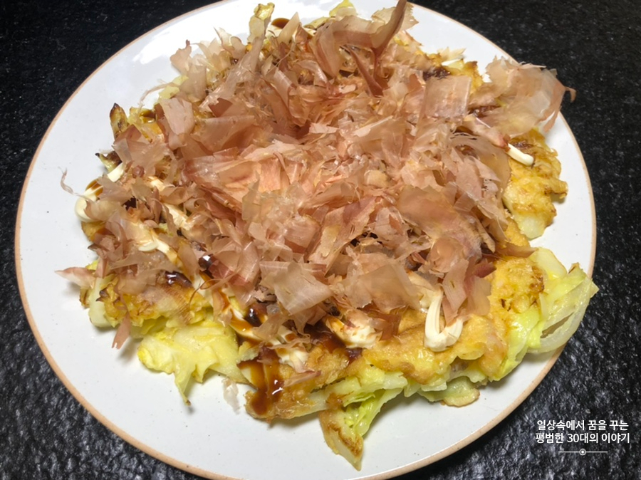 오코노미야끼 - 양배추, 양파, 새우, 계란, 부침가루, 가쓰오부시, 마요네즈, 돈까스 소스, 소금