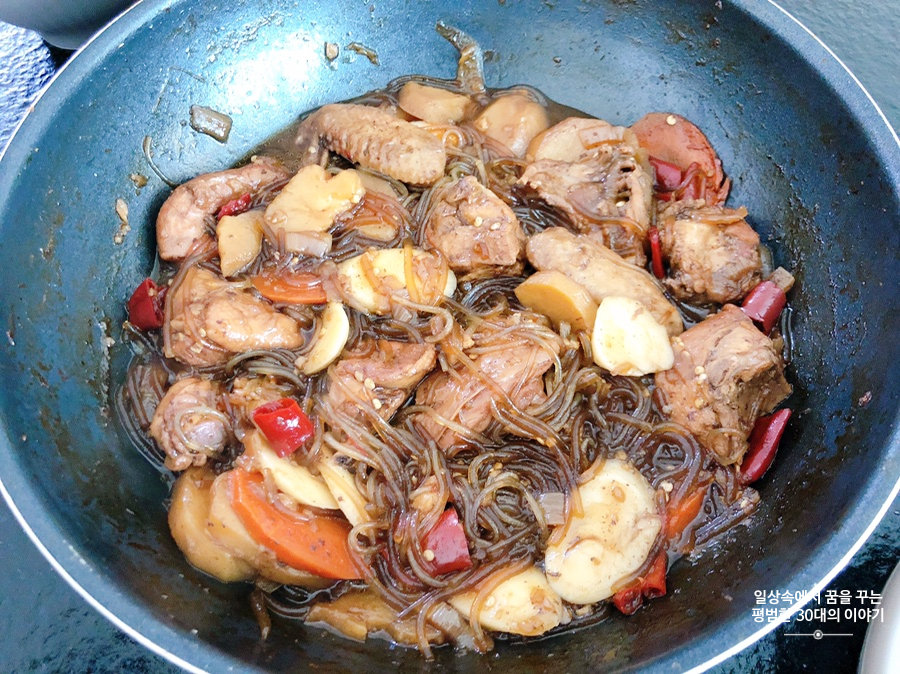 찜닭 - 당근, 감자, 양파, 닭, 당면, 건고추, 우유, 간장, 설탕, 올리고당, 다진마늘, 맛술, 참기름, 생강 가루