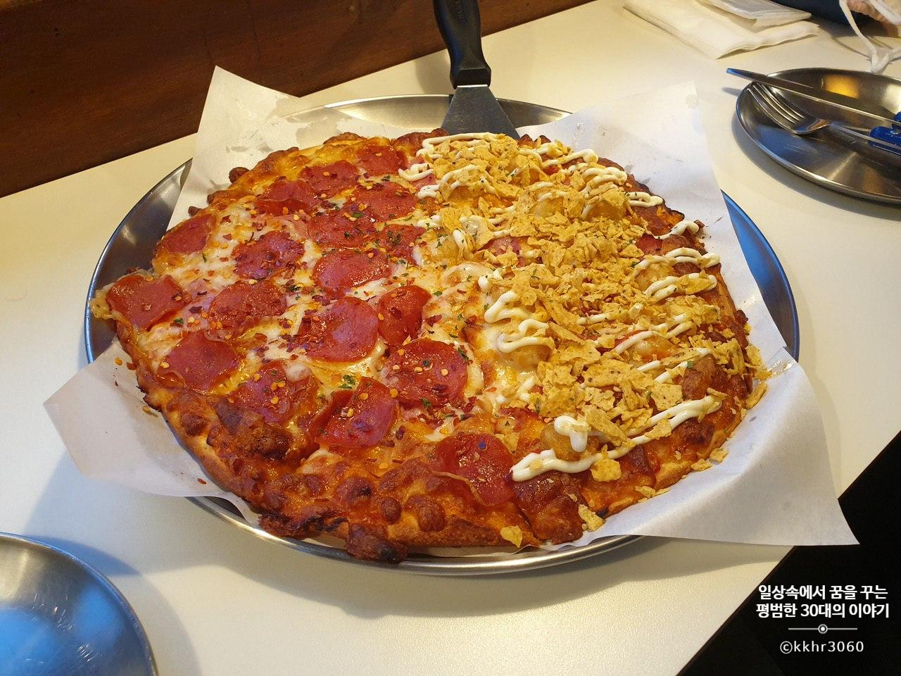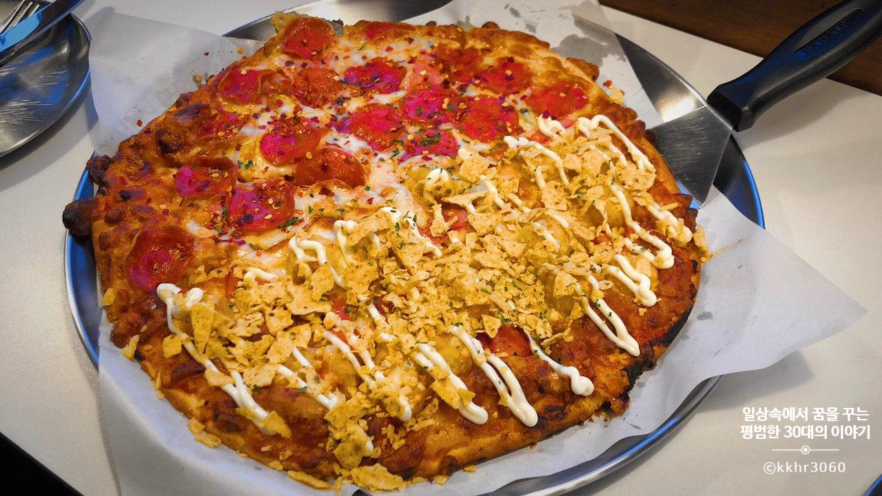 짝꿍이 외국인이다 보니 주인분께서 걱정이 되셨는지 하프앤하프 피자를 주문할 때 페퍼로니 피자가 살짝 매콤한데 괜찮냐고 물어보셨다. 그래서 우리가 얼마나 맵냐고 주인분께 물어봤더니 그렇게 많이 맵지는 않은데 외국인에게는 매울 수도 있다고 하시기에 그 정도면 괜찮을 듯하여 주문했다. 살짝 매콤한 소스에 베이컨과 페퍼로니가 올라간 페퍼로니 피자. 짝꿍이 먹어보더니 어깨를 으쓱하며 이제 한국생활 18개월 차, 이 정도 매운 거는 정말 아무것도 아니라는 표정을 짓는다. 페퍼로니 피자 옆에 튀긴 감자, 치즈 그리고 나초가 올라간 포테이토 피자가 있다. 나초 토핑이라니, 이전에는 본 적 없는 새로운 토핑이다. 포테이토 피자를 먹어본 짝꿍은 엄지를 척 올리며 나에게 배운 단어 '대박!'을 조용히 외쳤다. 나도 먹어보니 짝꿍이 외친 '대박'의 의미가 뭔지 알 것 같다. 꽤 신박한 조합으로 맛도 있다. 서울에서 그동안 갔던 수많은 화덕피자집들 중, 단연 최고라고 손꼽을 만큼 맛있는 피자는 아니지만 이 공간이 만들어내는 분위기, 합리적인 가격, 신박한 나초 토핑 등이 잘 어우러져 꽤나 괜찮은 피자집이라고 생각한다.