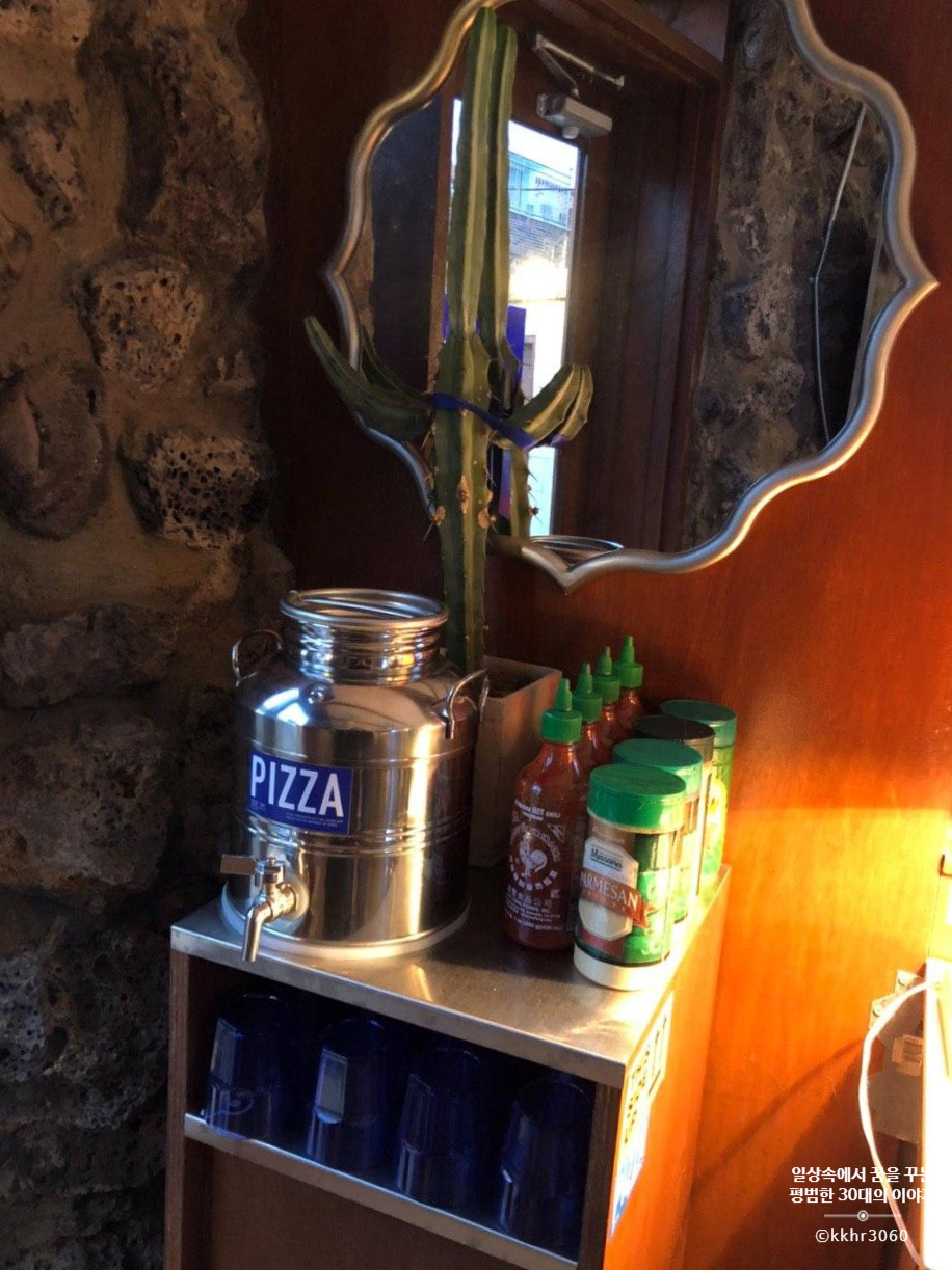 셀프바에는 물, 치즈 그리고 매운 살사소스가 준비되어 있다. 행즈의 공간 구석구석을 둘러보다 보니 작은 공간을 참 알차게 잘 사용하고 있다는 생각이 든다.