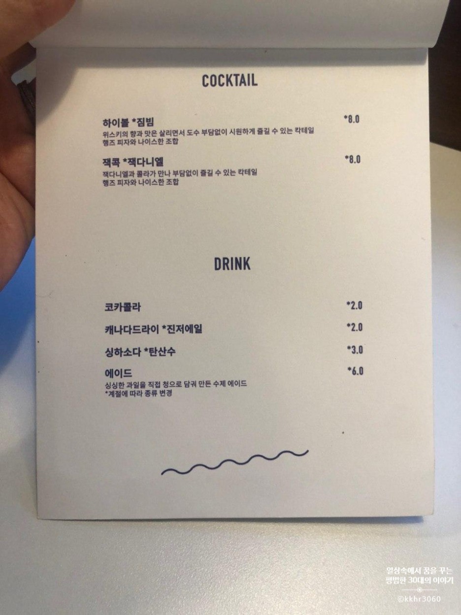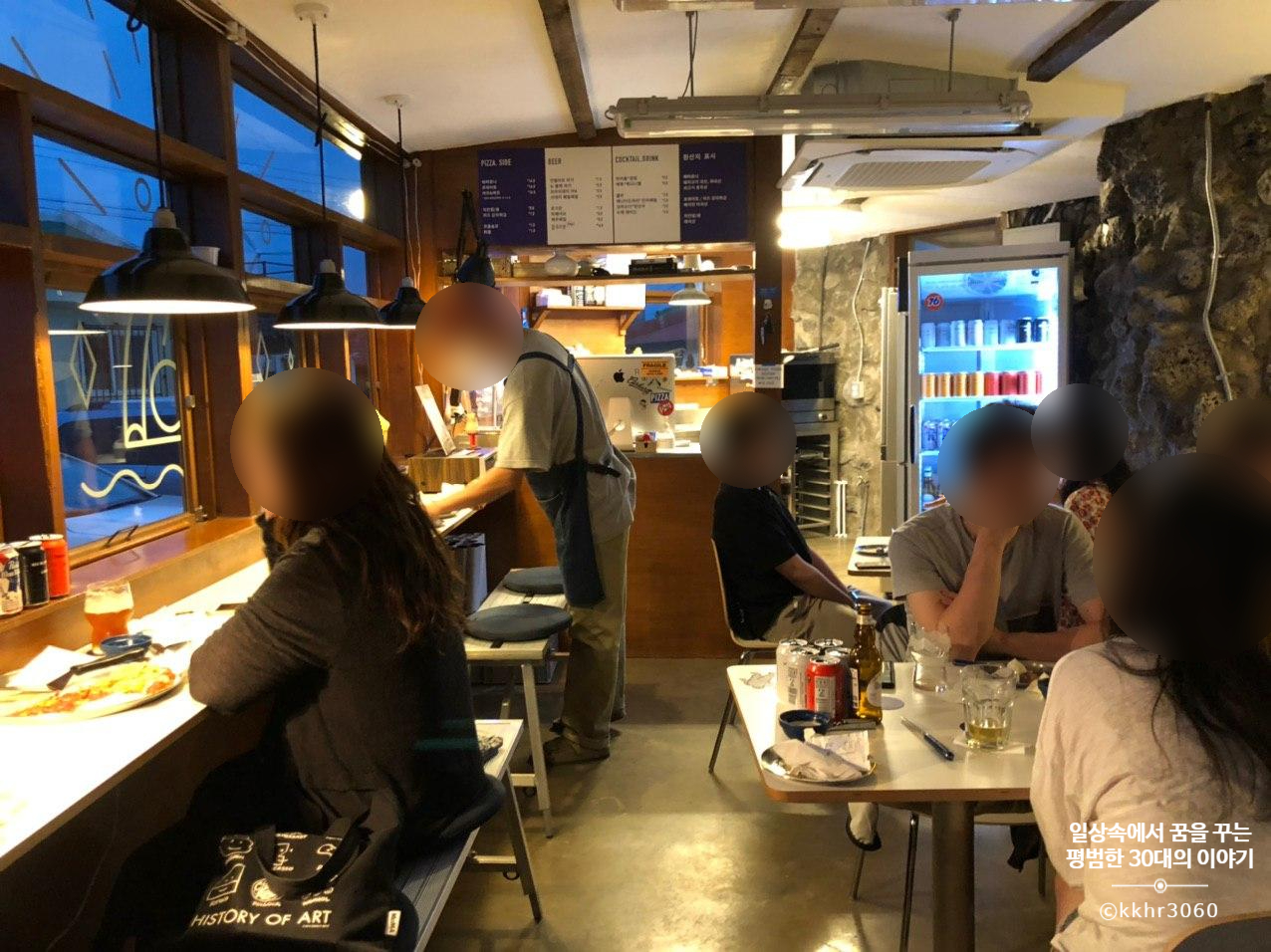 내부 공간은 그다지 넓지 않아 여러 명이 가기에는 다소 어려움이 있다. 5~6인석 테이블 하나, 4인석 테이블 하나 그리고 바 테이블이 있다. 바 테이블도 4명이 앉으면 꽉 찬다. 영업시간만큼이나 좌석들도 타이트하다. 하지만 그게 또 매력인 것 같다. 옹기종기 모여앉아 두런두런 이야기를 나누며 나누어먹는 피자라면 더 맛있지 않을까 싶은데 때론 공간이 내는 분위기가 음식을 더 맛있게 만들어주는 경우가 있기 때문이다.