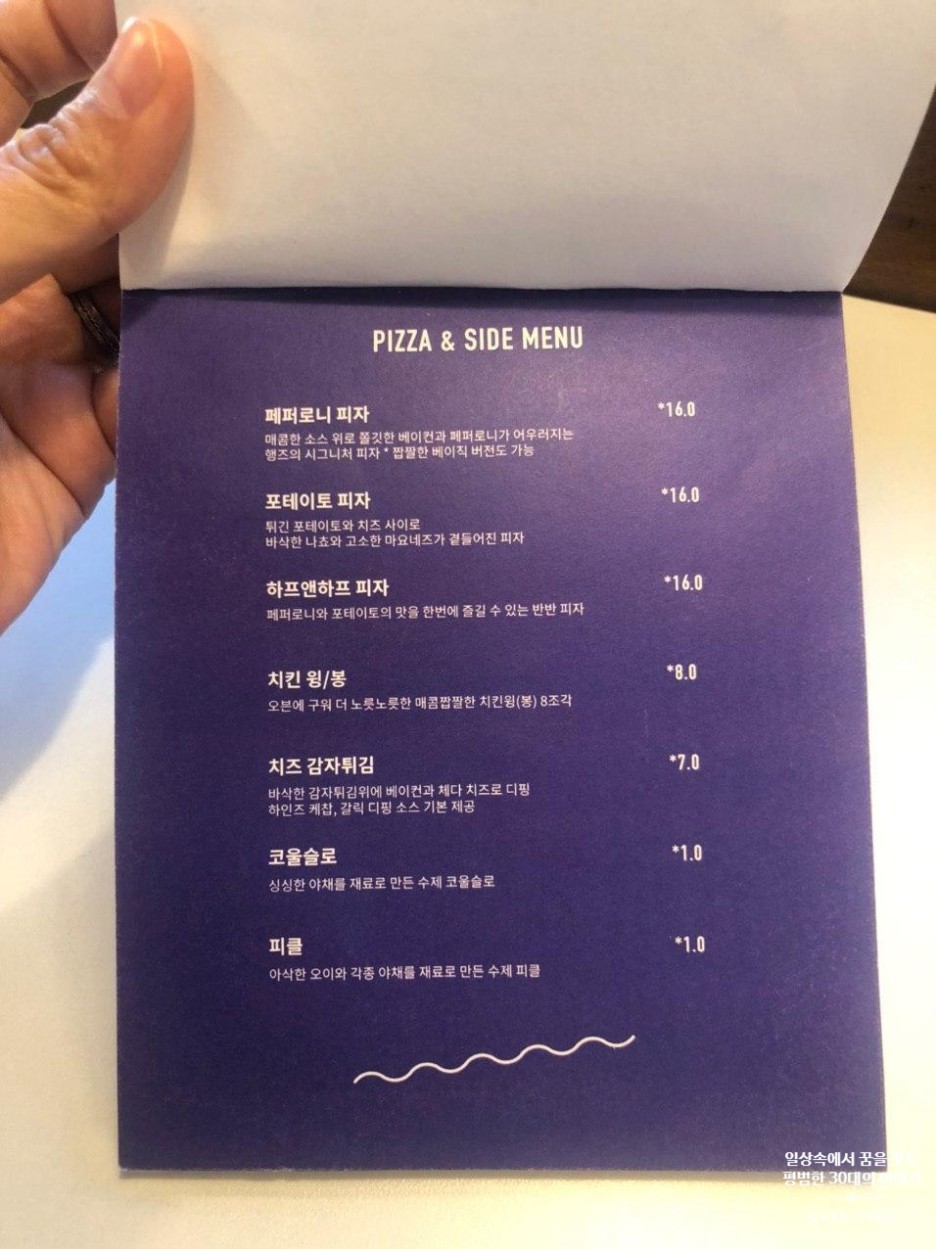 메뉴는 식당의 크기만큼이나 단출한데 주메뉴로는 페퍼로니 피자와 포테이토 피자가 있고 이 두 가지를 섞은 하프앤하프 피자가 있다. 그리고 사이드 메뉴로는 치킨 윙/봉, 치즈 감자튀김 그리고 코울슬로가 있다. 우리는 당연하다는 듯이 하프앤하프 피자와 치즈 감자튀김을 주문했다. 나는 원래 감자튀김을 좋아하는 사람은 아니었는데 감자튀김을 워낙 좋아하는 짝꿍 덕분에 자주 먹다 보니 익숙해져서 이제는 자연스럽게 감자튀김 메뉴가 있는 곳에서는 자연스럽게 감자튀김 메뉴를 주문한다. 집에서 만들어 먹으면 좋겠지만 둘이서 얼마 되지도 않는 감자튀김을 해먹으려고 그 많은 기름을 사용하고 싶지 않다는 핑계로 한 번도 해 먹은 적은 없다.