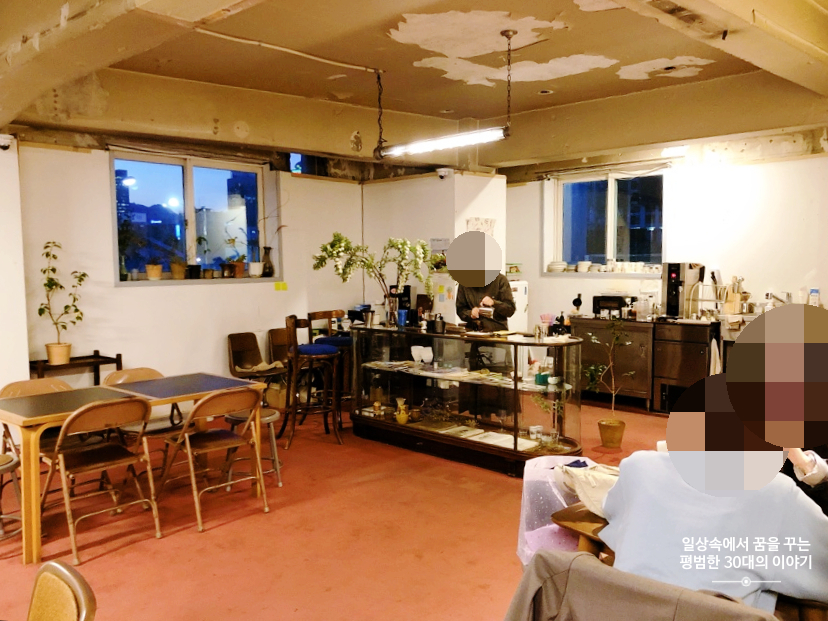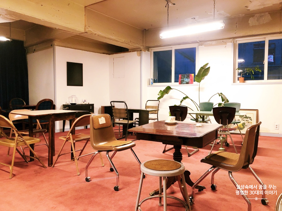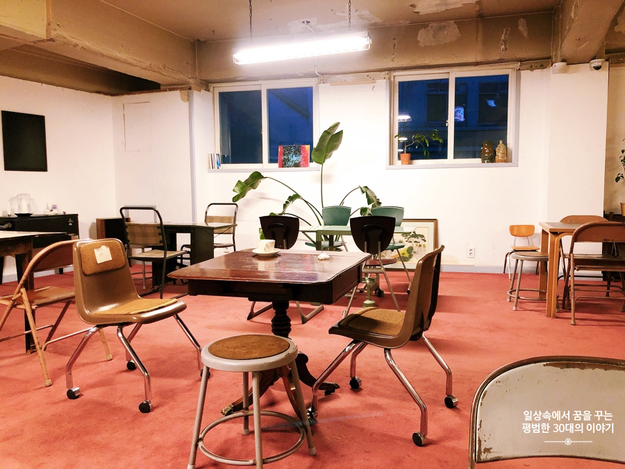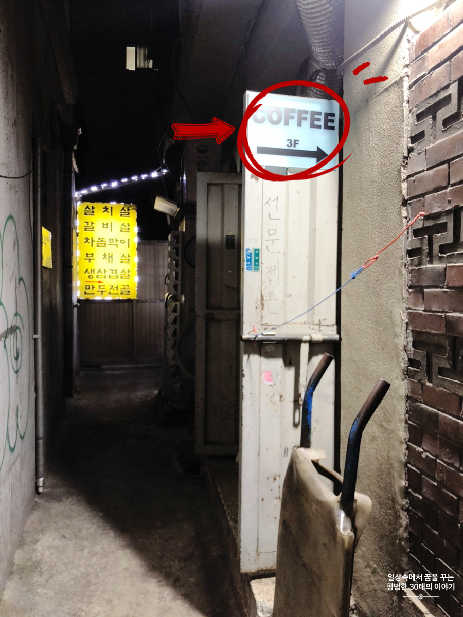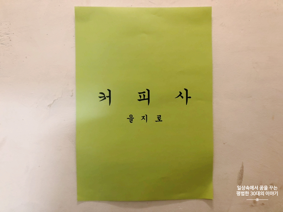 구석구석에 느낌 있는 공간이 많이 생겨나고 있는 곳 중 하나가 을지로 인근이 아닐까 싶다. 오랜만에 혼자만의 시간을 즐기기로 한 날, 을지로 주변에 갈만한 카페를 찾던 중 발견한 커피사. 2호선과 3호선이 만나는 을지로3가역 7번 출구에서 멀지 않은 곳에 위치해있는데 작은 골목 안에 카페로 갈 수 있는 계단이 위치해있어 자칫하다가는 그냥 지나치기 쉽다. 작은 골목 입구에 작게 '커피사'라고 적혀있는 안내문이 붙어 있으니 그걸 놓치지 않고 따라가면 된다. 카페가 있는 건물 계단을 오르다 보면 이런 곳에 카페가 있나 싶을 정도의 의구심이 드는 낡은 건물 3층에 위치해있다. 인테리어라고 할 것이 없을 정도로 내부는 단출하지만 구석구석 낡은 의자와 테이블이 서로 너무나 잘 어우러져서 그만의 깊은 분위기를 풍긴다.