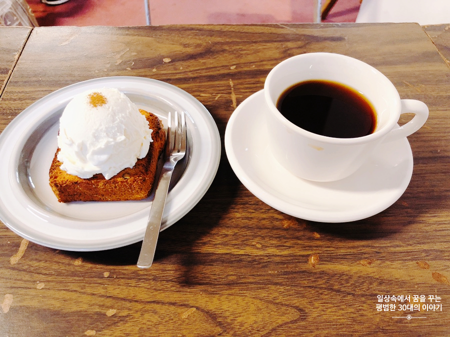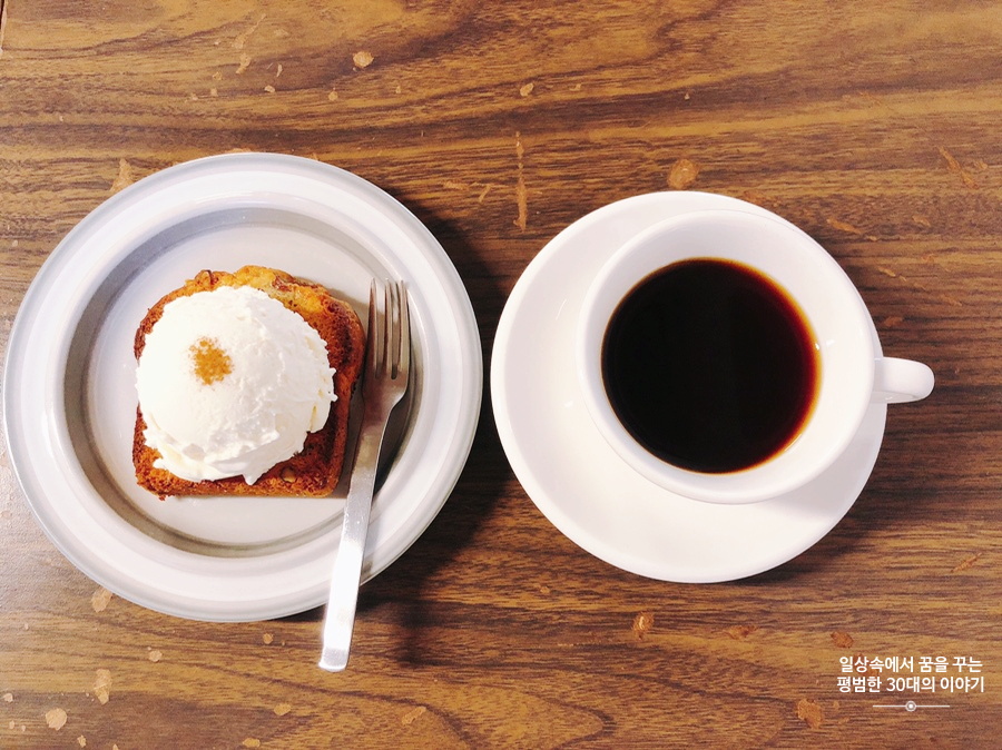 맨날 집에서 습관적으로 마시는 커피가 아닌 제대로 된 커피가 마시고 싶었기 때문에 따뜻한 드립 커피(5000원)을 주문했다. 원두는 두 가지 중에 한 가지를 고를 수 있었는데 막상 기억해 내려니 원두 종류는 기억이 잘 안 난다. 나는 산미 있는 원두를 좋아하기 때문에 산미 있는 원두를 골랐다. 그리고 이런 날엔 디저트가 빠질 수 없지! 하겐다즈 아이스크림 한 덩어리와 함께 나오는 바나나 케이크(6000원)도 함께 주문했다.