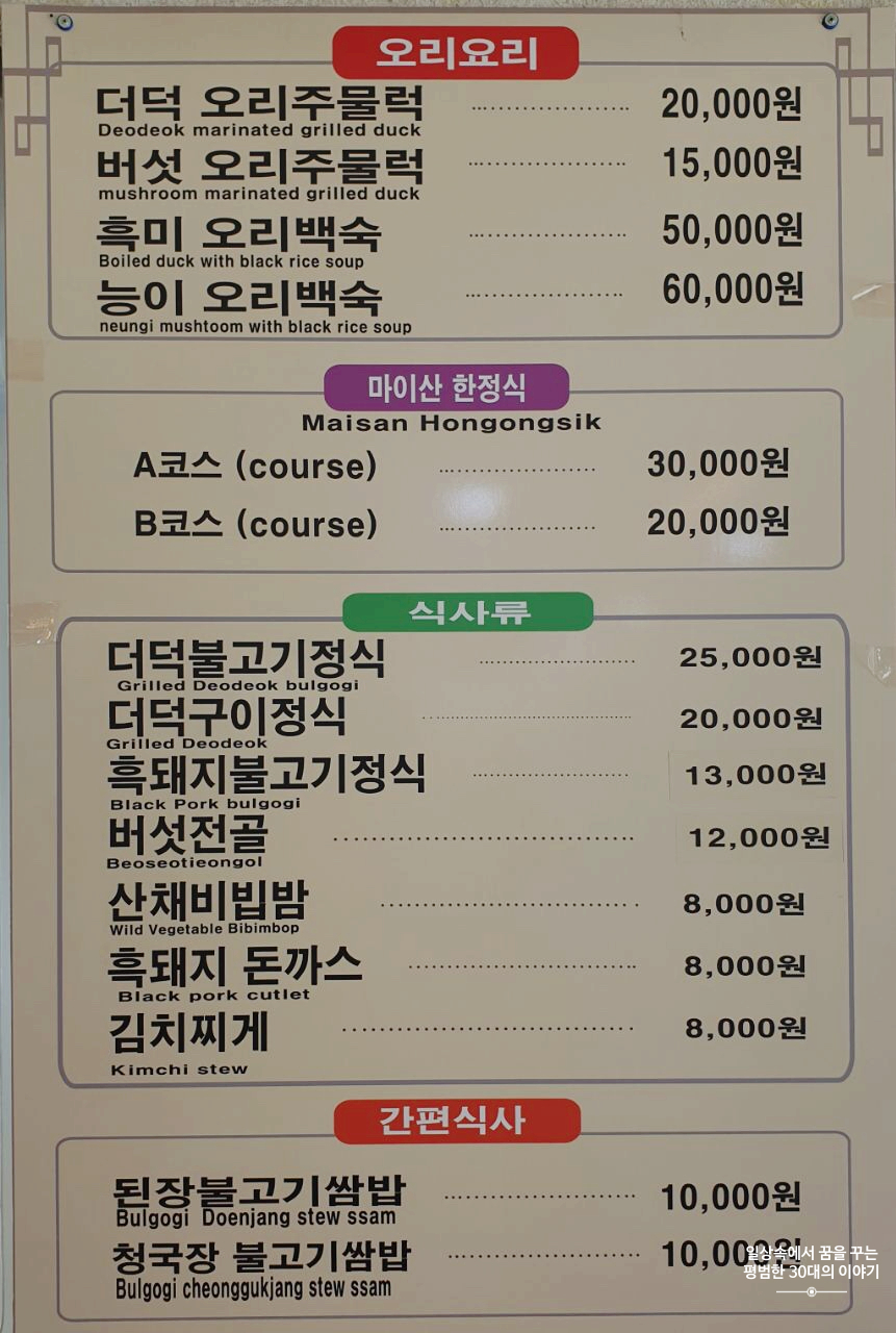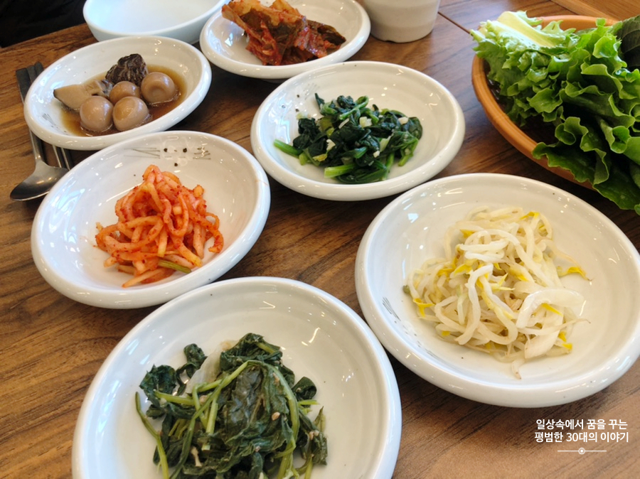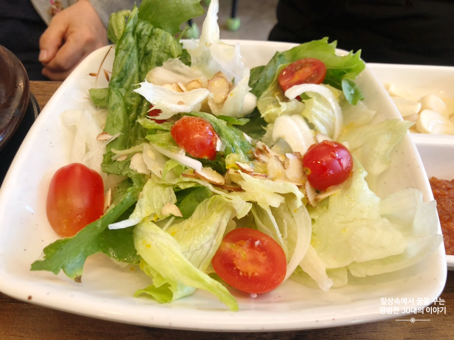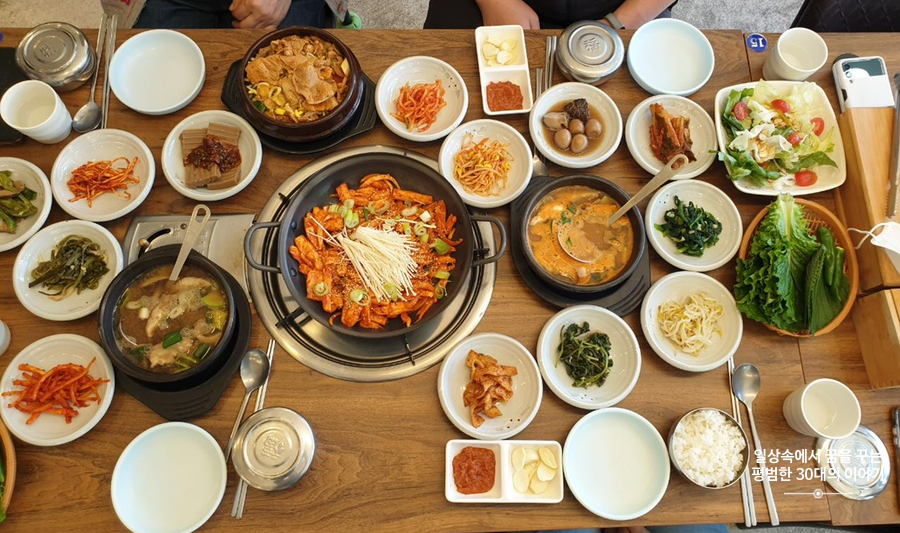 우리는 네 명이서 마이산 한정식을 주문하려고 했는데 지금은 안된다고 해서 더덕구이정식(1인분 20000원) 2인분과 흑돼지 불고기정식(1인분 13000원) 2인분을 주문했다. 밑반찬 13가지, 유자소스 샐러드, 쌈 야채, 된장찌개, 계란찜 그리고 청국장이 기본으로 나오고 메인 요리인 더덕구이와 흑돼지 불고기가 나왔다. 더덕구이와 흑돼지 불고기가 각각 2인분 나왔는데 2인분 치고 양이 꽤 많았다. 역시 음식은 전라도!!! 반찬 하나하나 직접 만든 듯 정성이 느껴지고 담백하면서 간이 딱 적당한 게 너무 맛있었다. 나의 최애는 청국장과 된장찌개였는데 진짜 구수하면서 담백한 게 집에서 만든 된장과 청국장으로 만든 맛이었다. 밥은 조금은 과하게 고슬거려서 아쉽긴 했는데 이건 개인적인 취향이라 고슬밥을 좋아하는 사람은 괜찮을 듯. 다른 말이 필요 없는 속이 편해지는 밥상!!! 서울 근교에 이런 음식점이 있다면 정말 자주 갈 텐데... 의외로 서울 근교에 이런 음식점 찾기가 쉽지가 않다. 더덕구이랑 흑돼지 불고기는 특별한 맛은 아니었지만 그렇다고 맛이 없지도 않았다. 메인 요리보다 밑반찬이 더 만족스러웠던 마이산 자연밥상.