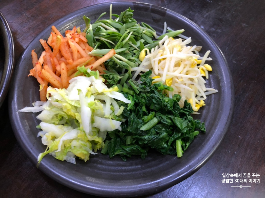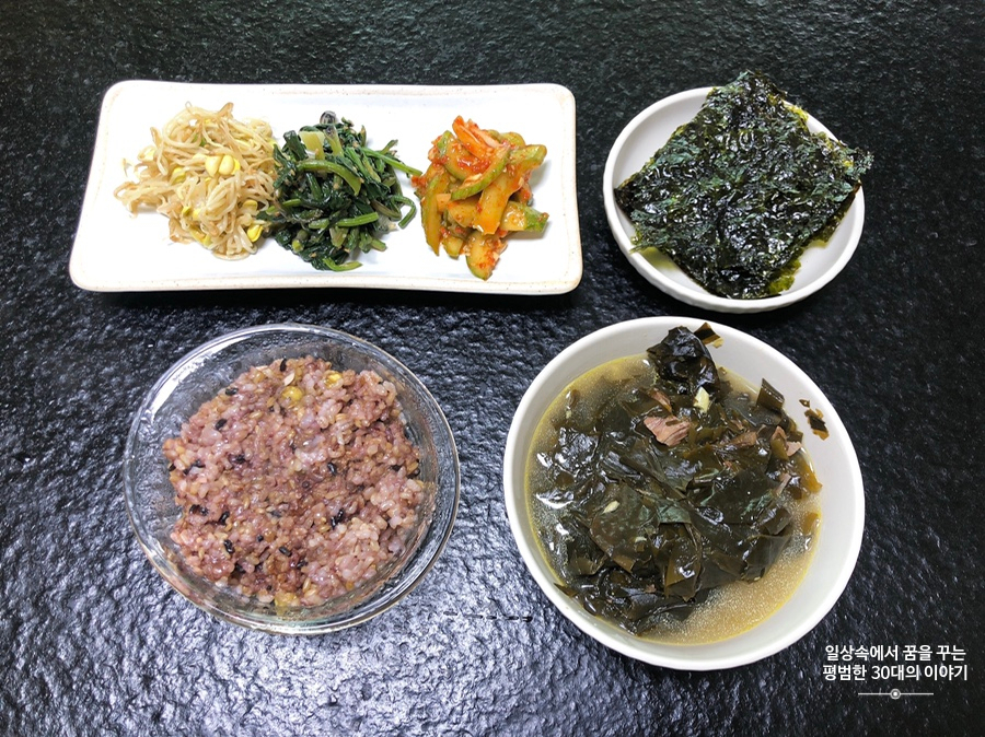 메뉴: 콩나물무침, 시금치무침, 오이무침, 조미김, 미역국