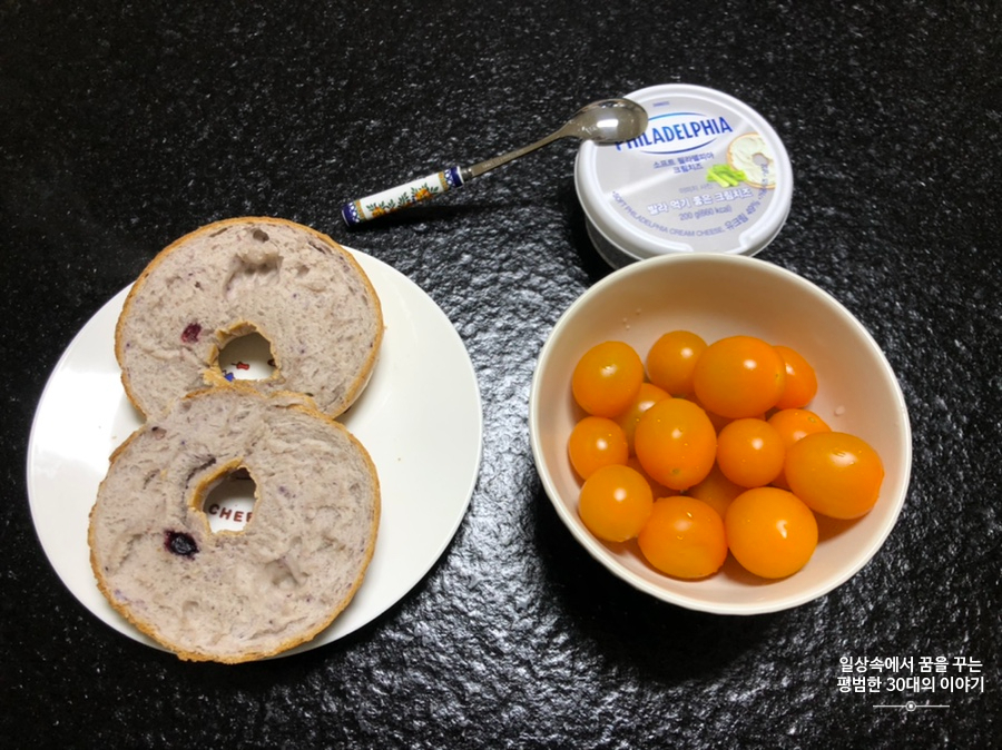 저녁: 베이글, 크림치즈, 방울토마토 |