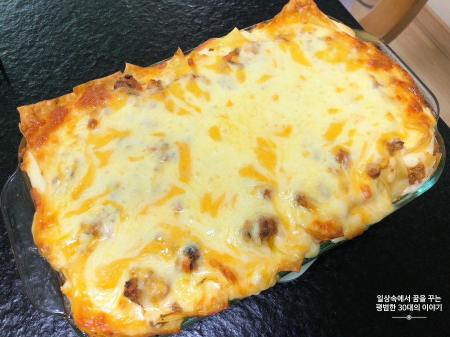 라자냐 - 당근, 표고버섯, 양파, 홀토마토, 샐러리, 바질가루, 오레가노가루, 월계수잎, 소금, 다진마늘, 피자치즈, 밀가루, 우유, 버터, 라자냐면