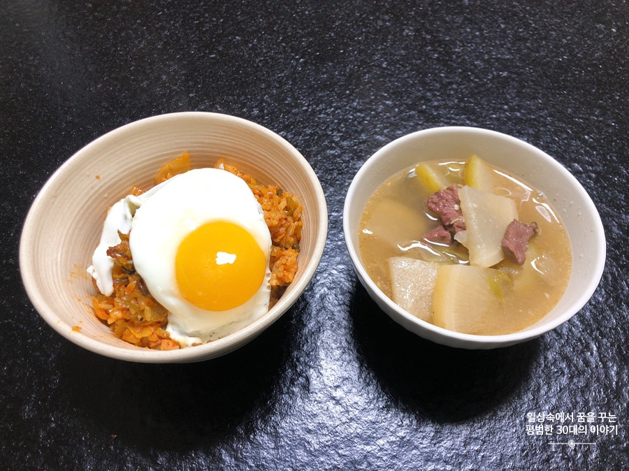 메뉴: 스팸 김치 볶음밥, 뭇국