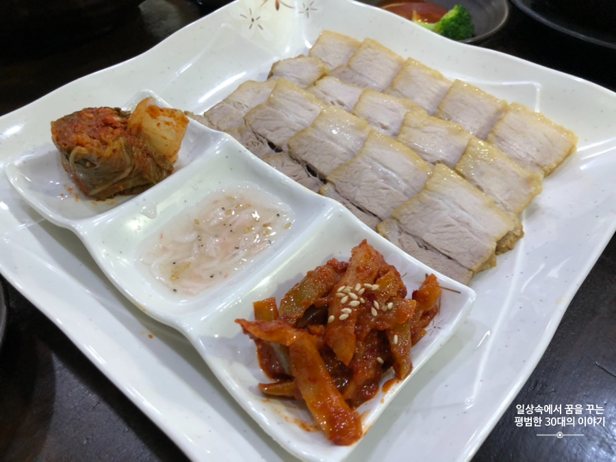 메뉴: 가족식사(부뚜막 청국장에서 보쌈정식, 비지찌개, 청국장)