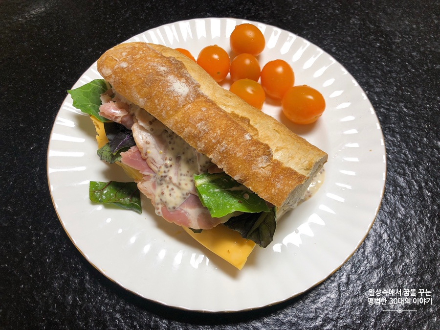 잠봉 샌드위치 - 잠봉, 야채, 치즈, 바게트, 마요네즈, 홀머스터드, 꿀, 레몬즙