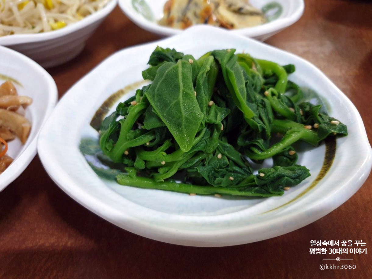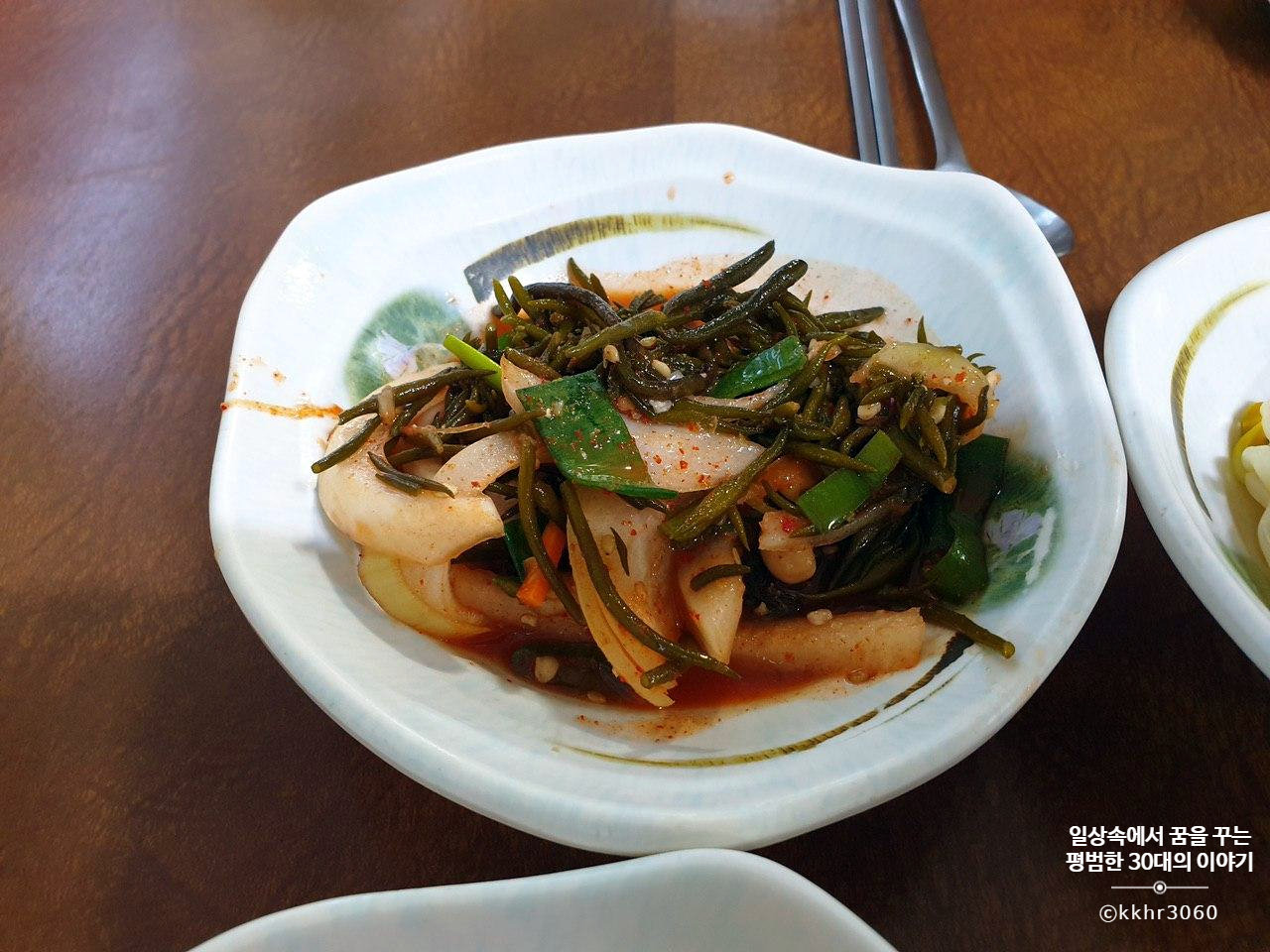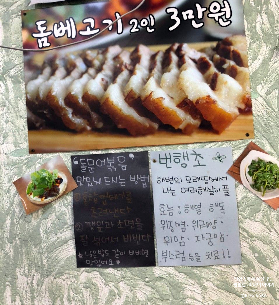 우리는 소금바치 순이네에서 가장 유명한 돌문어볶음 小(30000원) 하나와 공깃밥 하나를 주문했다. 주문을 하자 밑반찬 6개가 나오는데 매일매일 다른 종류의 반찬이 나오는지는 모르겠고 우리가 방문했을 때는 콩나물무침, 어묵볶음, 전, 김치, 톳 무침 그리고 번행초가 나왔다. 번행초는 제주도를 여행하면서 처음 먹어보는 거였는데 벽면에 친절하게 번행초에 대한 설명이 적혀있더라. 아무래도 우리가 마감시간이 얼마 남지 않은 때에 식사를 하러 가서인지 전은 차가워서 좀 그랬지만 나머지 반찬들은 맛이 있었다. 그중에서도 번행초가 맛이 있어서 두 번이나 리필해 먹었다.