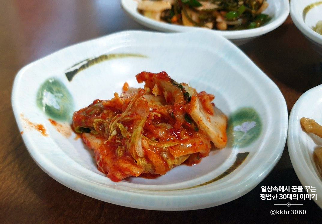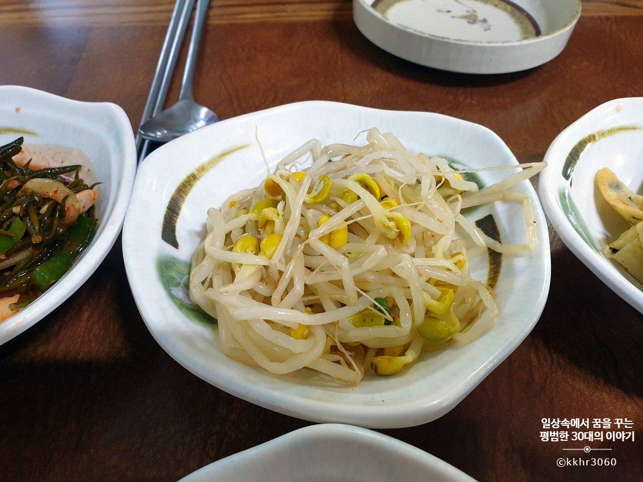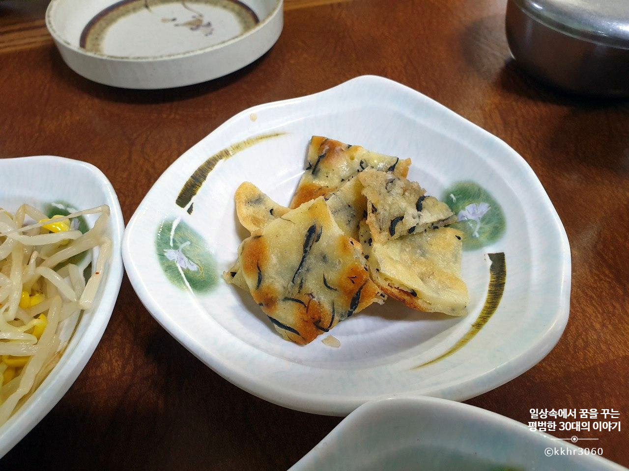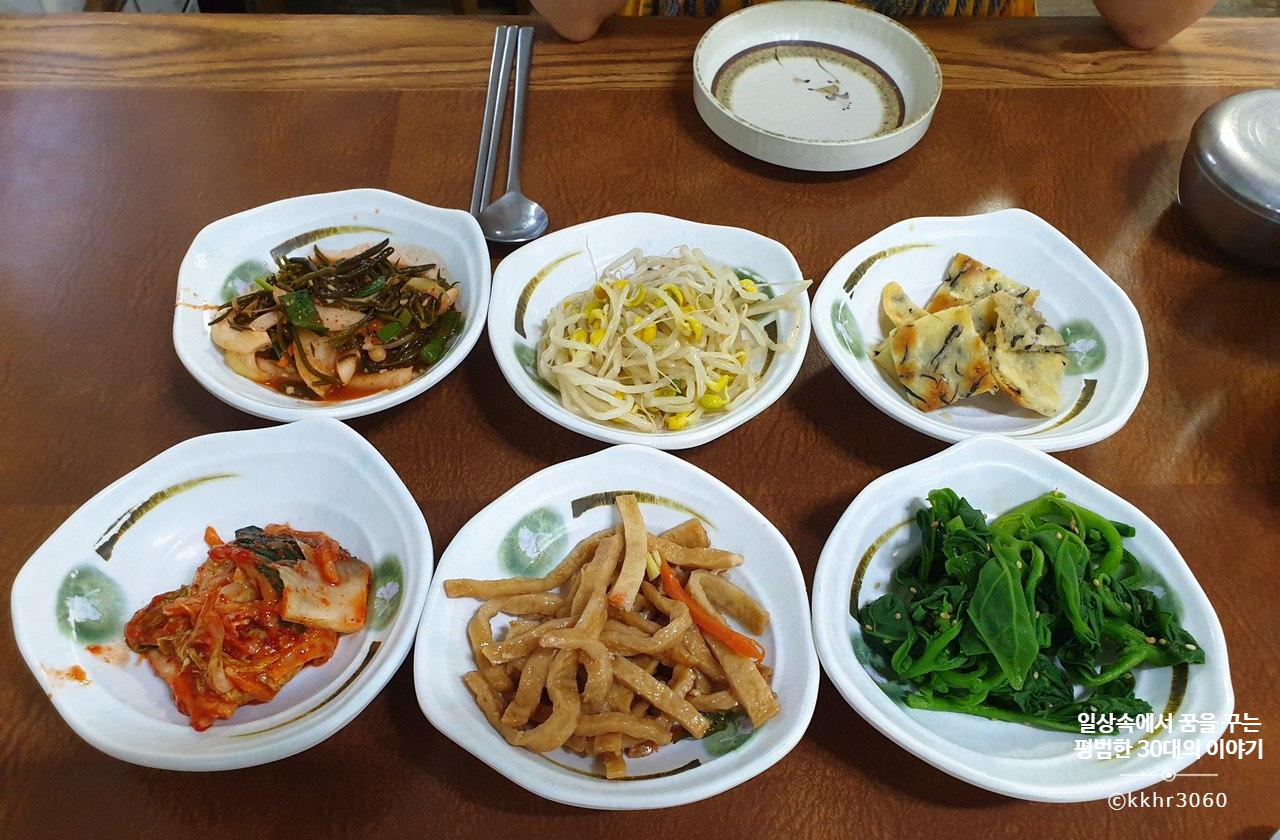 우리는 소금바치 순이네에서 가장 유명한 돌문어볶음 小(30000원) 하나와 공깃밥 하나를 주문했다. 주문을 하자 밑반찬 6개가 나오는데 매일매일 다른 종류의 반찬이 나오는지는 모르겠고 우리가 방문했을 때는 콩나물무침, 어묵볶음, 전, 김치, 톳 무침 그리고 번행초가 나왔다. 번행초는 제주도를 여행하면서 처음 먹어보는 거였는데 벽면에 친절하게 번행초에 대한 설명이 적혀있더라. 아무래도 우리가 마감시간이 얼마 남지 않은 때에 식사를 하러 가서인지 전은 차가워서 좀 그랬지만 나머지 반찬들은 맛이 있었다. 그중에서도 번행초가 맛이 있어서 두 번이나 리필해 먹었다.