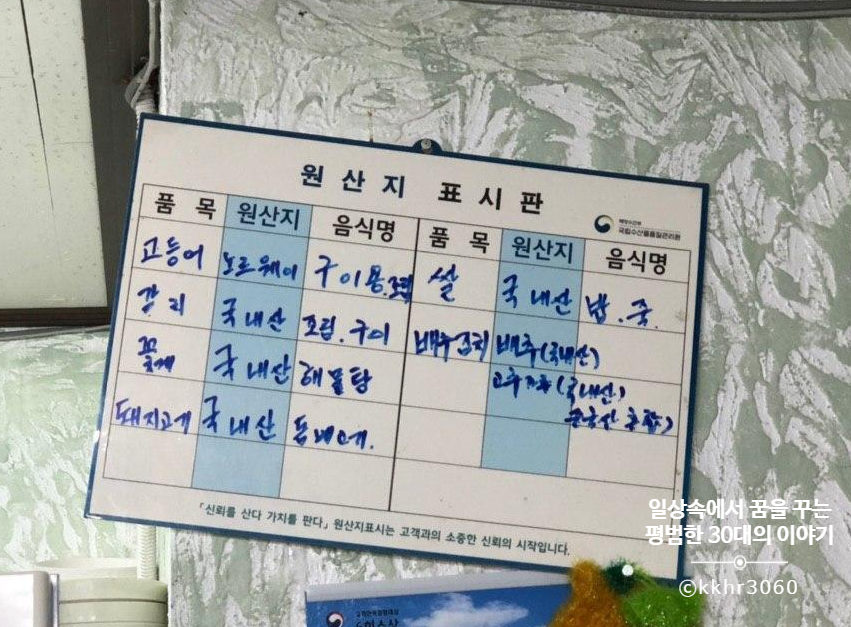 오늘도 그냥 지나칠 수 없는 원산지 표시판. 역시나 고등어는 노르웨이산이고 나머지는 국내산이 대부분이다. 물론 모든 식자재가 다 기재되어 있는 건 아니라 그런 점은 아쉽다.