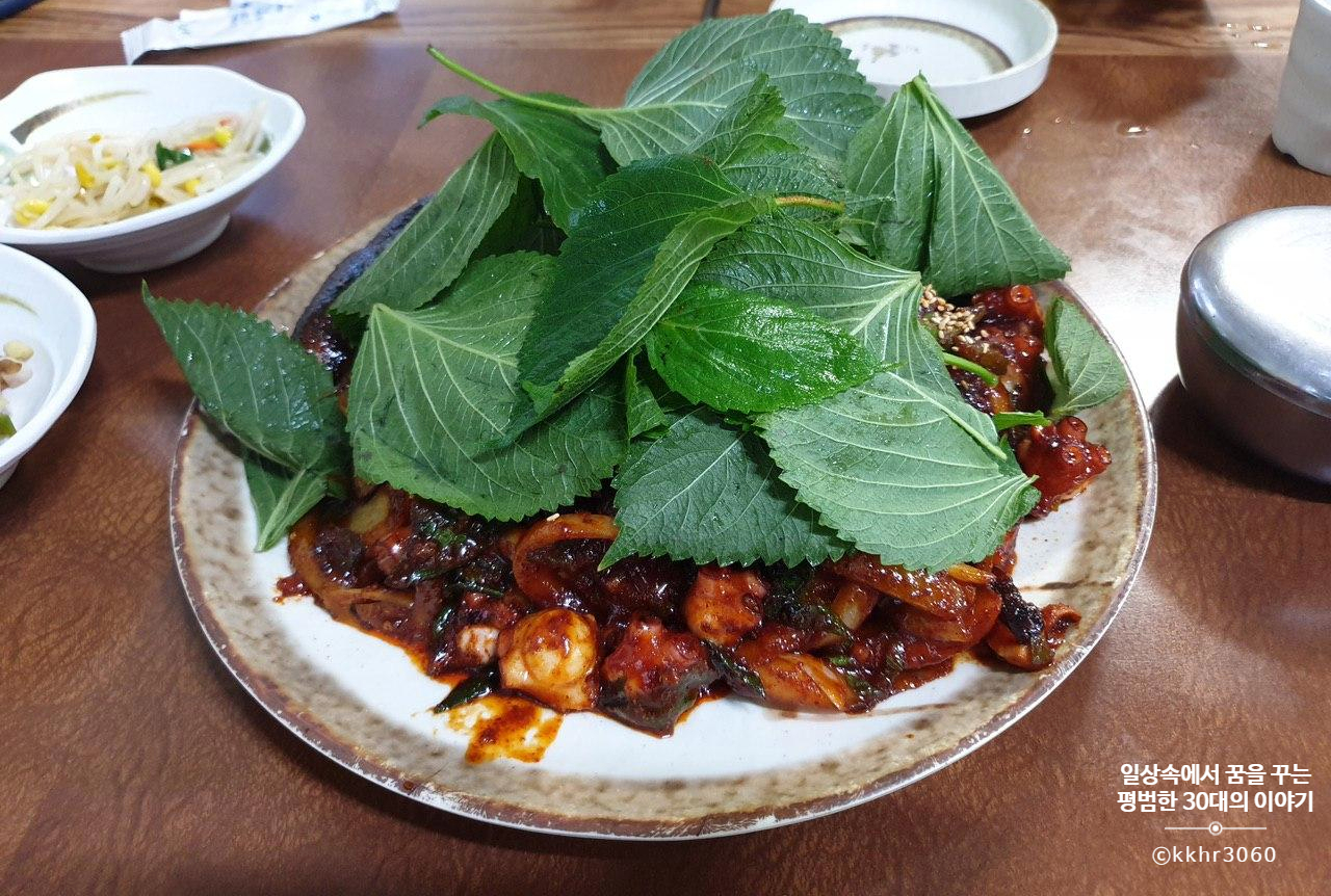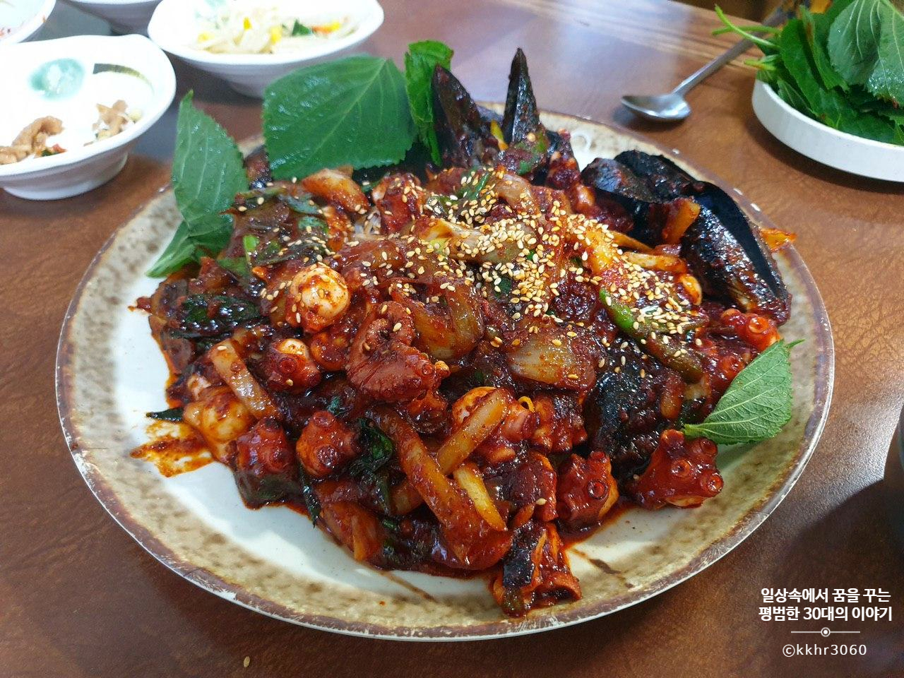 아무래도 짝꿍이 매운 음식을 잘 못 먹다 보니 돌문어볶음을 살짝 덜 맵게 해달라고 주문할 때 부탁을 드려놓았었다. 사장님이 돌문어볶음을 가져다주시면서 덜 맵게 한다고 볶았는데도 매울 수 있다면서 매우면 번행초랑 콩나물을 넣어 같이 비벼 먹으면 덜 맵고 맛도 더 좋다길래 그렇게 먹었는데 사장님 말이 맞았다. 혹시나 하는 마음에 공깃밥을 하나 주문해서 돌문어볶음 소스에 비볐는데 결국 배가 불러서 다 못 먹었다. 둘이서 먹기에는 돌문어볶음 小가 양이 많았다. 홍합, 돌문어, 깻잎, 양파 등이 많이 들어가 있는 데다가 안에 소면도 들어있어서 더 그런듯하다. 아래 사진에서는 안 보이지만 젓가락으로 겉을 살포시 들어 올리면 소면이 맨 밑바닥에 깔려있다. 처음에 나올 때는 깻잎 한 무더기가 토핑처럼 올려져 있는데 돌문어볶음이 뜨거울 때 소면이랑 다 같이 섞어주면 금세 깻잎 숨이 죽어 맛있게 먹을 수 있다.