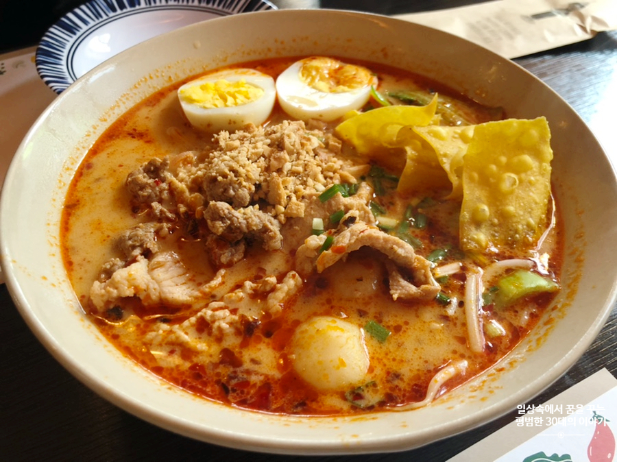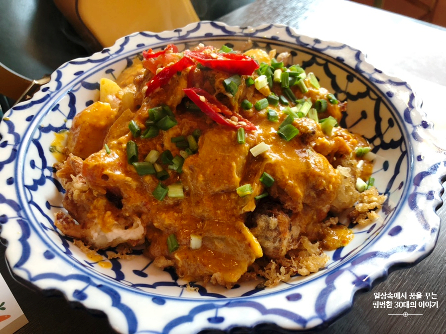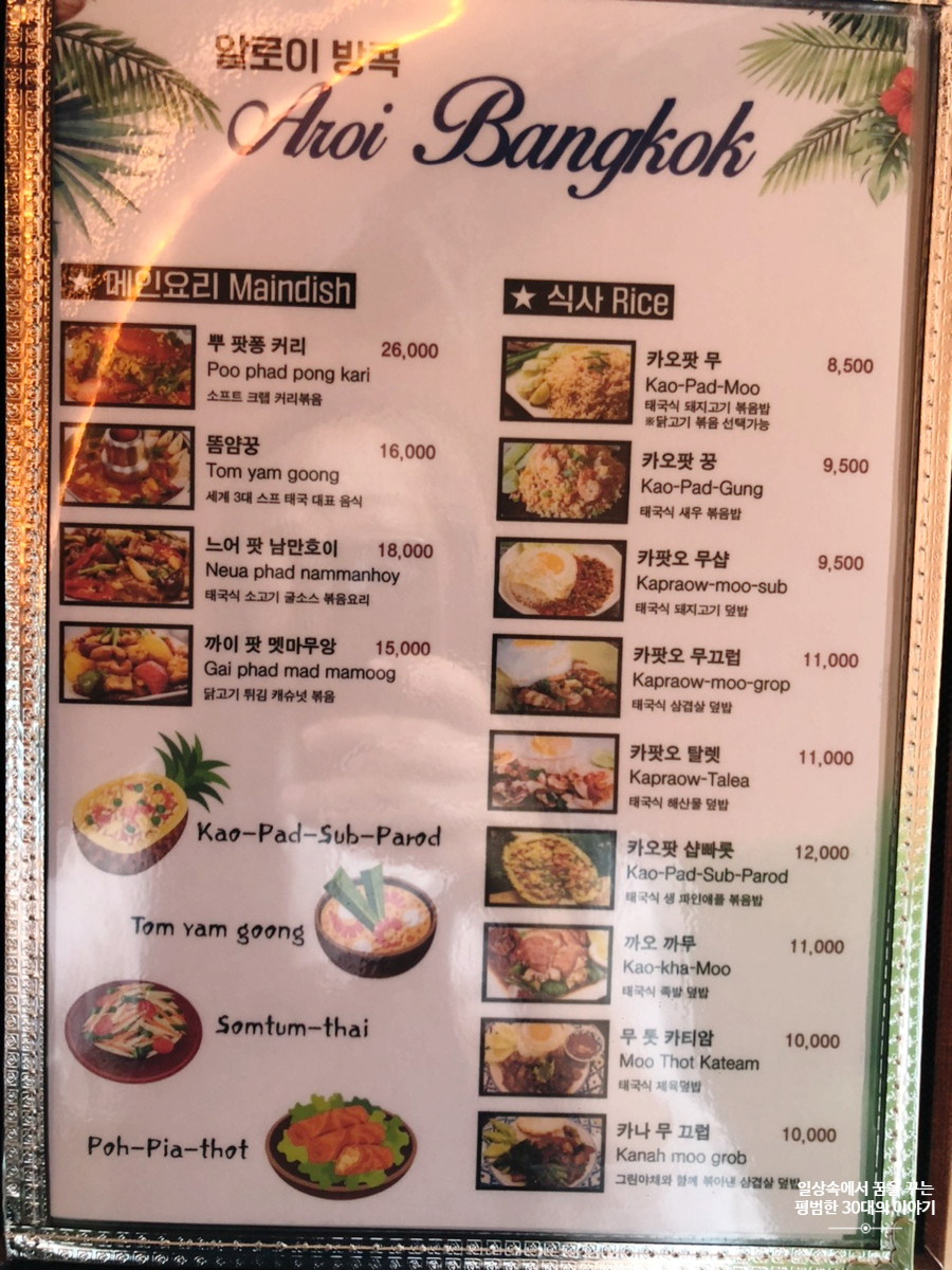 알로이 방콕은 태국 요리 전문점인데 태국 현지 요리사가 직접 요리를 한다고 한다. 실제 방문해 보니 알로이 방콕에서 일하는 분들 모두 태국 현지 분들인 것 같았다. 나는 무척 배가 고픈 상태였으므로 3가지 정도 주문을 할 생각이었으나 주문받으시는 분이 둘이서 먹기에는 너무 많지 않겠냐며 만류하셔서 두 가지만 주문하였다. 우리는 꾸웨이 띠아오 똠양(10000원)과 뿌 팟퐁 커리(26000원)을 주문하였다. 우리가 첫 손님이었고 우리가 주문한 메뉴가 준비되기 전까지는 손님도 우리뿐이었기 때문에 나오는데까지 오랜 시간이 걸리진 않았다. 사실 나는 똠얌꿍을 워낙 좋아해서 여러 번 한국에서 똠얌꿍을 시도해 봤었는데 예전에 태국 여행 때 먹었던 똠얌꿍의 맛과 똑같은 곳을 찾기는 어려웠다. 알로이 방콕은 태국 현지 요리사가 직접 요리한다고 해서 기대를 많이 하고 갔었는데 이곳의 똠얌꿍도 맛이 약한 편이었다. 아무래도 똠얌꿍이 호불호가 있는 메뉴이다 보니 한국 손님이 접하기 쉽게 순화시킨 게 아닌가 싶다. 뿌 팟퐁 커리도 현지와는 조금 다른 맛이었다. 그저 현지에서 먹던 맛과 비교를 하자면 아쉽다는 것뿐이지 맛만 놓고 보면 맛은 있었다. 가격도 비싸지도 싸지 않은 가격에 맛도 어느 정도 있기 때문에 태국 음식이 먹고 싶을 때 종종 방문하게 되지 않을까 싶다.