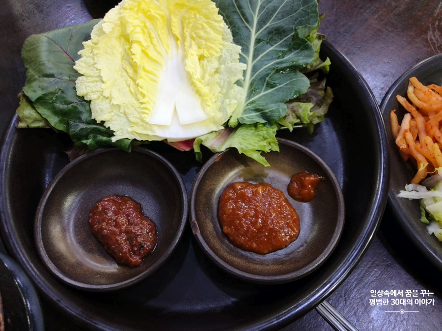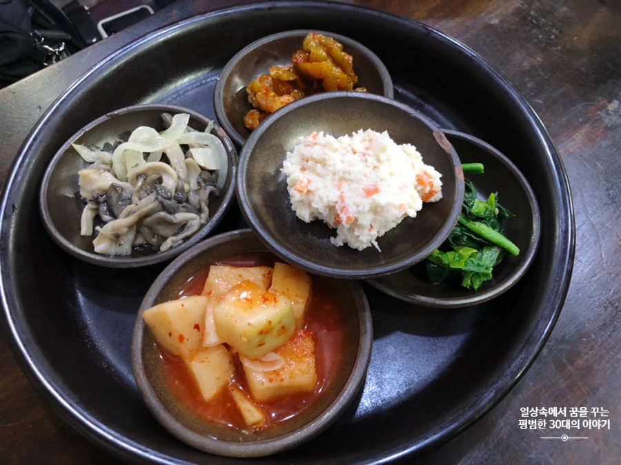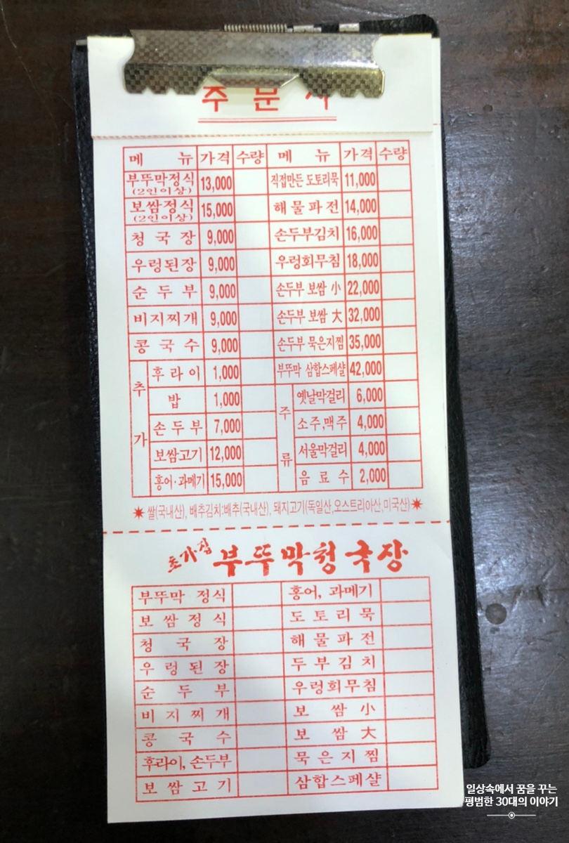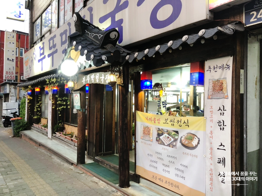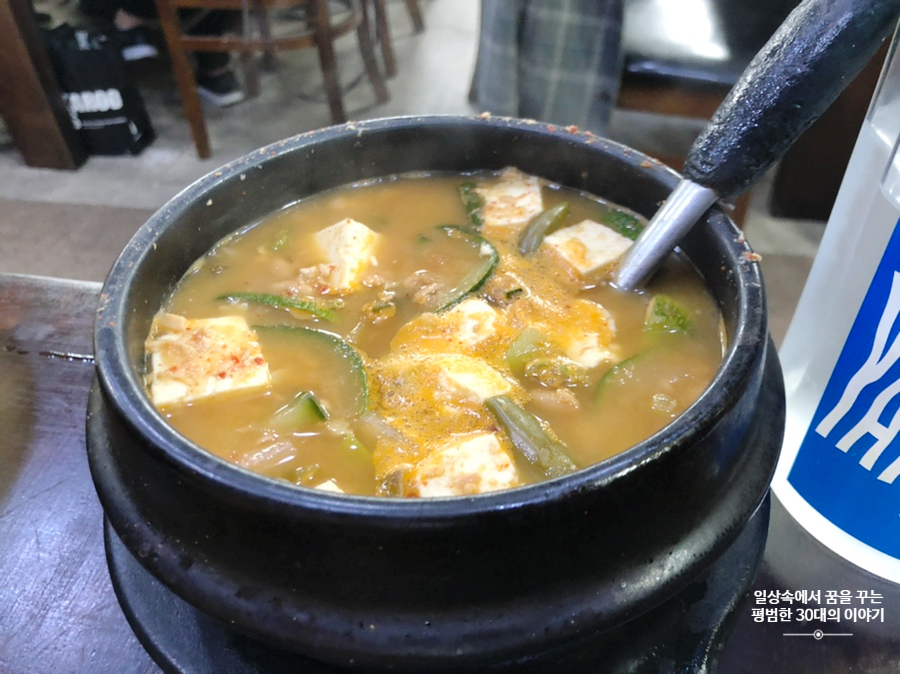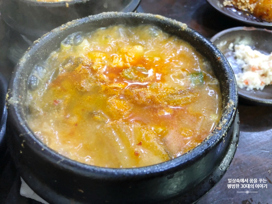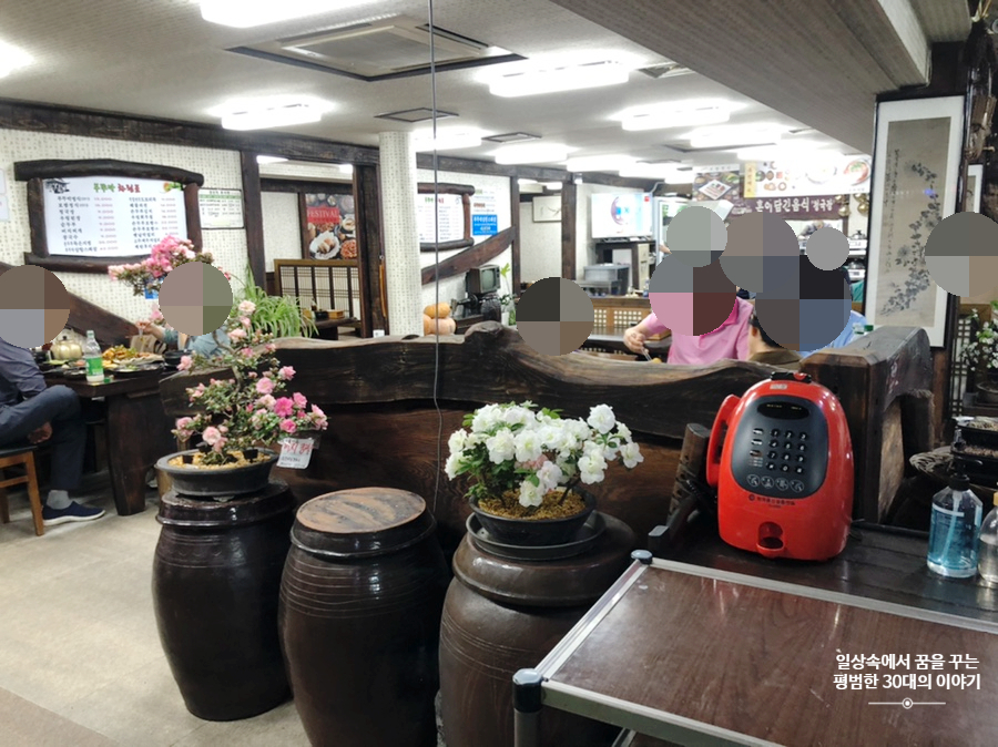 며칠 전부터 계속 청국장이 먹고 싶었는데 도저히 냄새 때문에 집에서 해먹기는 엄두가 나지 않아 고민을 하던 찰나, 내가 청국장이 먹고 싶다고 했던걸 기억하고 있던 동생이 가족 식사하러 가자고 해서 가게 된 부뚜막 청국장 독산점. 주차는 길가에 무작위로 그냥 하는 분위기였다. 다 먹고 집에 와서 검색을 해보니 체인점으로 이곳 말고도 지점이 여러 군데 있었다. 겉에서 봤을 때와는 다르게 내부가 무척 넓었는데 대부분 나이 지긋하신 50대 이상 손님이거나 우리와 같은 가족 손님이었다.