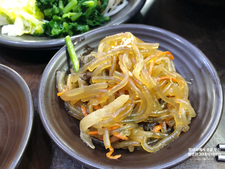 우리는 넷이서 보쌈정식 2인(1인 15000원), 비지찌개(9000원) 그리고 청국장(9000원)을 주문했다. 보쌈정식에는 돌솥밥, 청국장 그리고 보쌈이 나오고 비지찌개와 청국장에는 보리밥과 나물이 나온다. 기본적으로 밑반찬이 다양하게 나와서 좋다. 보쌈은 그냥 정식의 구색을 맞추기 위한 수준으로 2인분이라고 하기에는 양이 적은 편이었고 맛도 그저 그랬다. 그나마 정식에 나오는 청국장 양이 가장 마음에 들었다. 그리고 청국장과 비지찌개 단품은 9000원이라는 가격에 걸맞지 않게 무척 작은 뚝배기에 나왔는데 아마 보리밥이랑 나물이 같이 제공되기 때문에 그런 게 아닌가 싶으면서도 아무리 그래도 메인 요리인데 양이 너무 말이 안 되는 게 아닌가 싶을 정도로 의아했다. 맛은 청국장은 냄새가 강하지 않으면서도 구수해서 무척 맛있게 먹었는데 비지찌개는 이도 저도 아닌 맛이라서 다음에는 절대 안 시킬듯하다. 집에서 해먹는 것보다도 못한 맛이라 실망이 이만저만이 아니었다. 그래도 내가 가장 먹고 싶었던 청국장이 맛있었기 때문에 그나마 만족스러운 식사를 할 수 있었다.