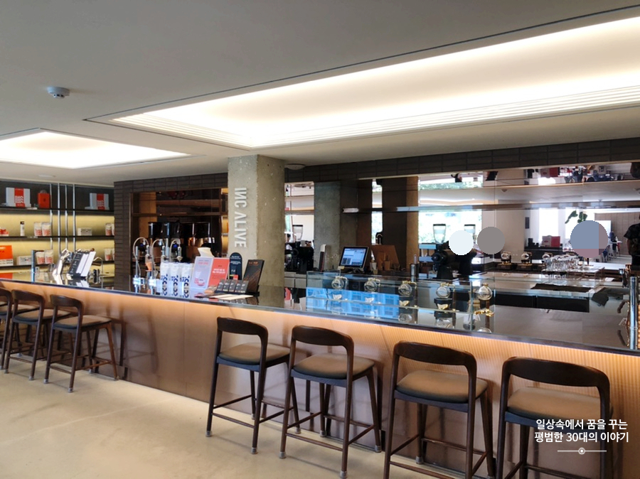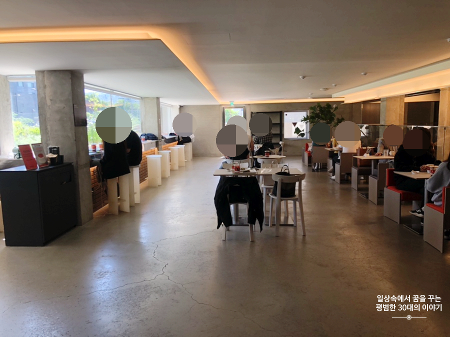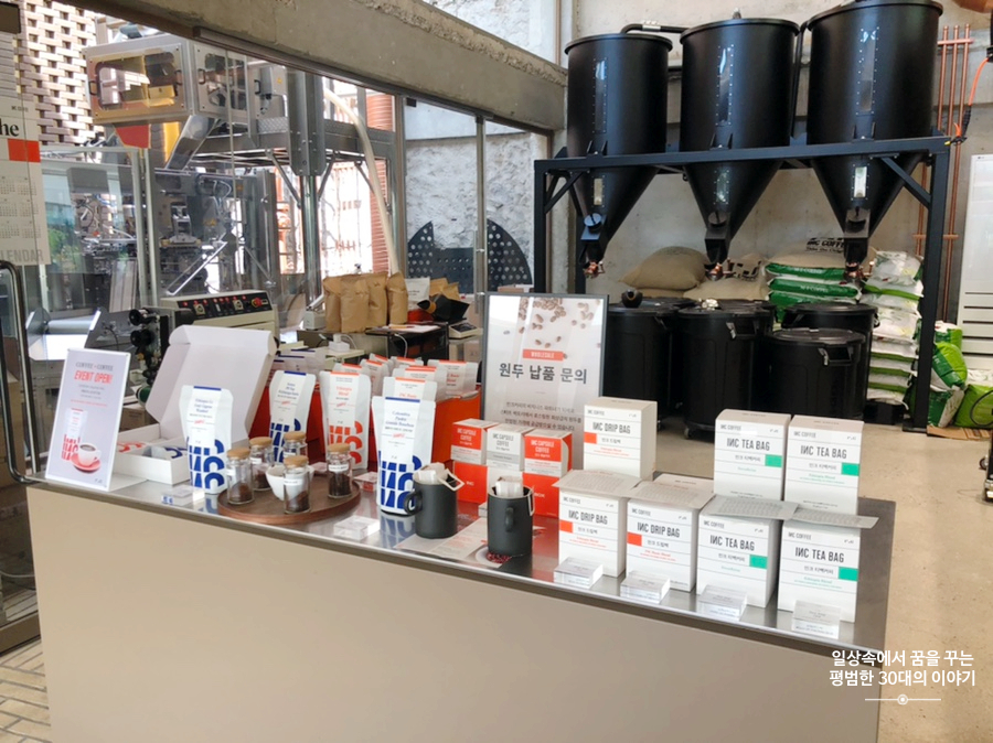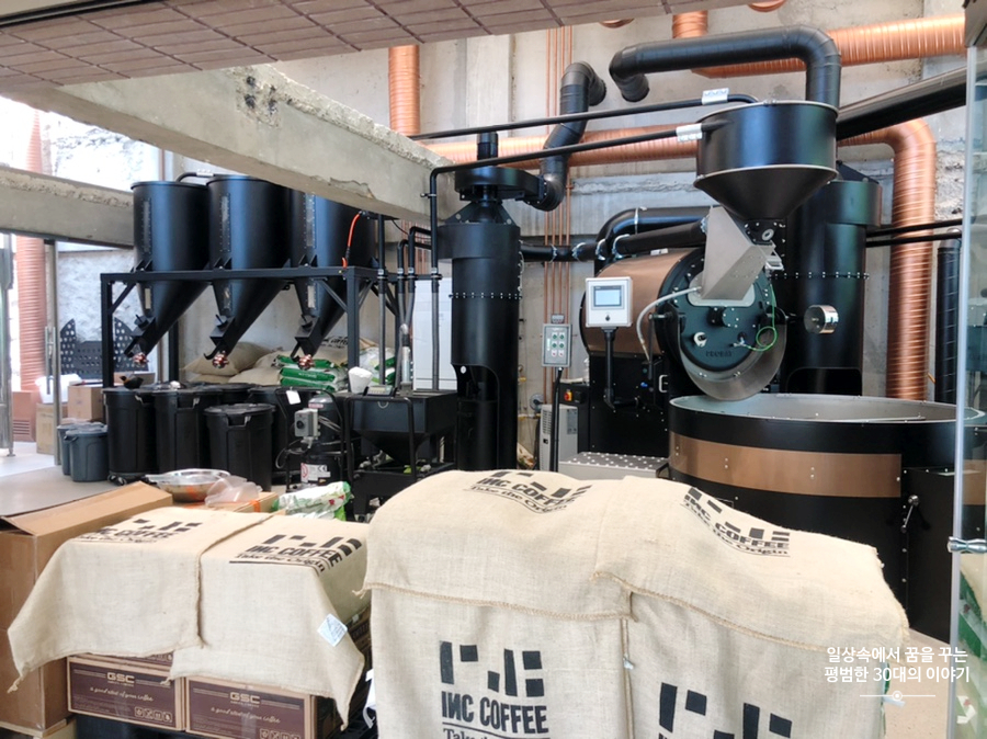 생긴지는 좀 되었지만 있는지도 모르고 있다가 엄마가 동료에게 집에서 그다지 멀지 않은 곳에 괜찮은 카페가 생겼다고 해서 다녀왔다. 위치는 7호선 가산디지털단지역 6번 출구에서 그다지 멀지 않은 곳에 위치해있다. 겉에서 봤을 때는 그다지 커 보이지 않은데 들어가 보면 지하 1층부터 3층까지 무척 넓은 공간이 펼쳐져 있어 당황스러울 지경이다. 공간 자체가 넓기도 하지만 좌석 간 간격도 넓고 중간중간 빈 공간들이 있어 더 넓게 느껴지는 것 같기도 하다. 들어서자마자 오른 편에 어마 무시하게 큰 로스팅 기계가 있는데 안에 구조를 보니 왠지 이전에 공장이었던 것을 리모델링한 것 같았다.