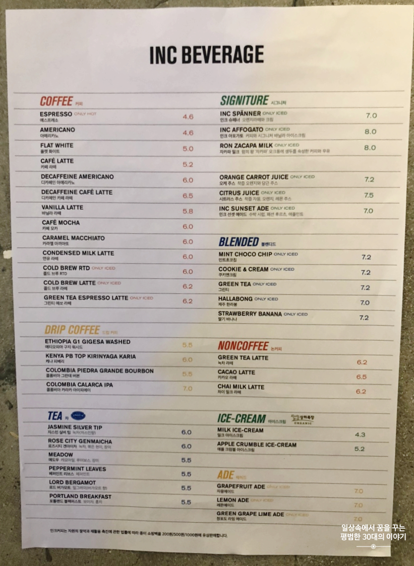 지하 1층에 빵을 굽는 공간이 따로 있는 만큼 판매하고 있는 빵과 케이크의 종류도 다양하고 음료의 종류도 다양했다. 그리고 드립 백, 잼, 캡슐커피 등 다양한 제품을 팔고 있어서 캡슐커피를 살까 했었는데 디카페인이 없어서 못 샀다. 우리는 디카페인 아메리카노(6000원), 아이스 아메리카노(4600원), 오케주스(7200원) 그리고 빵을 하나 구매했다. 커피 자체는 산미가 좀 있어서 호불호가 좀 있을 것 같은데 산미를 좋아하는 내 입맛에는 무척 맛있었다.(남동생은 산미를 그다지 안 좋아하므로 맛이 그냥 그랬다고) 오케주스는 오렌지, 당근 주스인데 그야말로 예상 그대로의 건강한 맛! 모든 게 마음에 들었지만 아쉬웠던 점이 한 가지 있다면 바게트 위에 치즈가 올려져 있는 빵을 구매했는데 그대로 먹기에는 너무 차가워서 따뜻하게 데워줄 수 있냐고 물어봤는데 불가능하다고 하더라. 물론 판매하고 있는 대부분의 빵이 데워주지 않아도 되는 그런 종류라 그런 거일지도 모르겠지만 고객 입장에서는 그 부분이 좀 아쉬웠다. 인크커피 가산점의 가장 큰 장점은 카페 내부에 있다 보면 이곳이 우리 동네지만 우리 동네 같지 않고 서울이지만 서울 같지 않아서 좋더라. 뭔가 멀리 외곽에 바람 쐬러 나온 기분이 들게 해주던 쉼터 같던 공간이었다.
