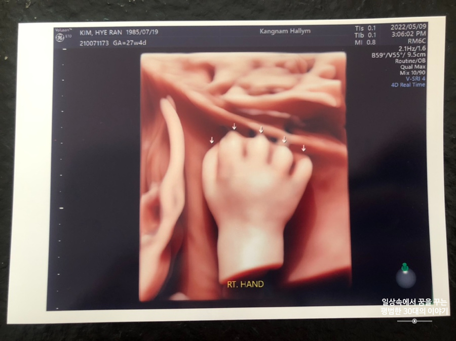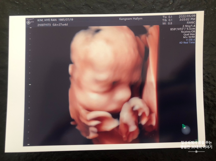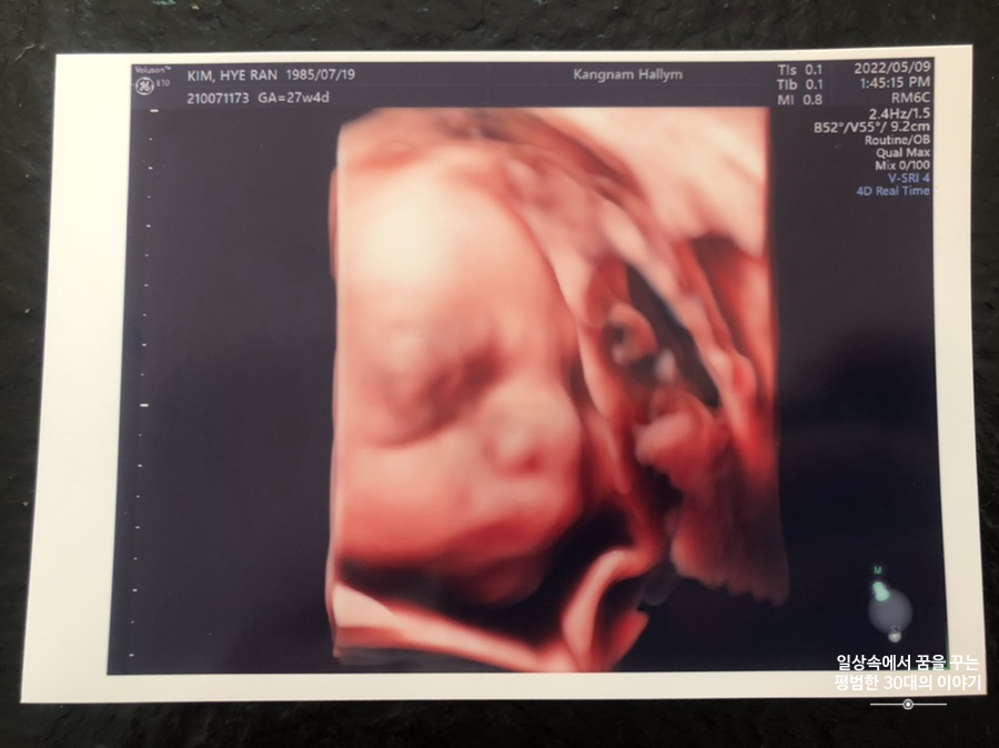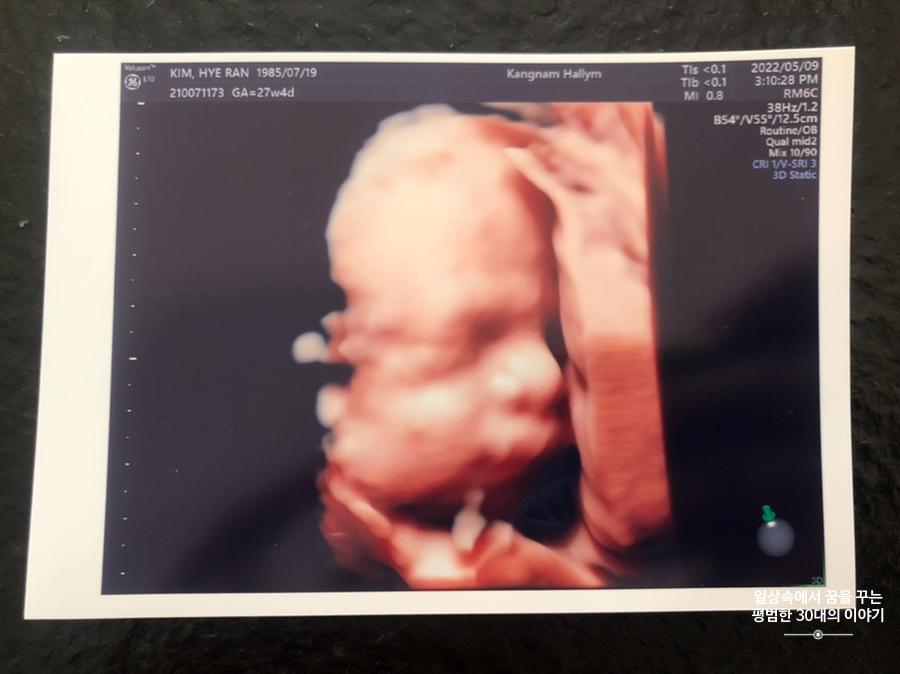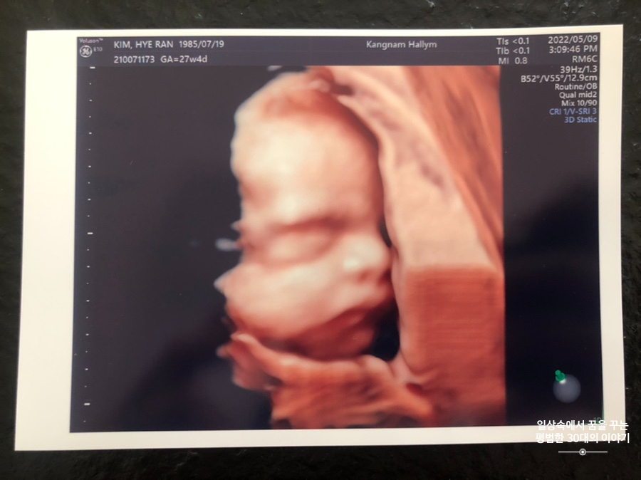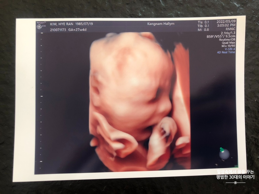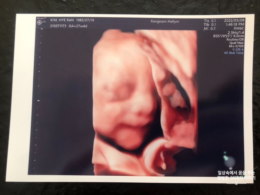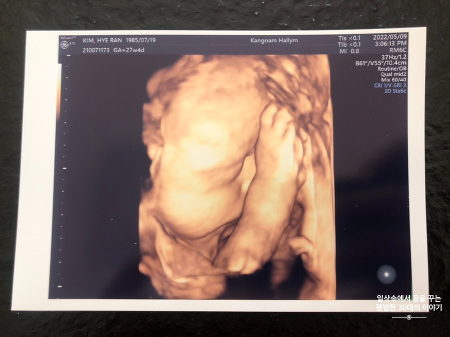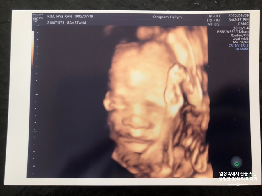 오늘은 입체 초음파 보는 날!!! 입체 초음파는 처음인데다 3주 만에 이안이 얼굴을 본다 생각하니 무척 설레는 마음으로 병원에 갔다. 첫 번째 시도에서는 계속 내 등 쪽으로 얼굴을 대고 엎드려 있어 실패! 초코우유 먹고 열심히 걸은 후, 30분 뒤에 다시 진행한 두 번째 시도에서는 얼굴 반쪽을 보여줬다. 얼굴 전면을 보지 못해 너무 아쉬웠지만 그래도 손가락 빨고 있는 모습, 웃고 있는 모습, 입 뻐끔 거리는 모습, 발차기 하는 모습, 손가락 쥐었다 폈다 하는 모습, 손을 휘적휘적 거리는 모습 등 다양한 모습을 보여줘서 그것만으로도 충분히 만족스러웠다. 내가 다니고 있는 강남성심병원은 입체 초음파가 다른 병원에 비해 무척 비싼 편인데(진료비 내역을 보니 초음파 진단료가 129800원 나옴) 그나마 위안을 삼을 수 있는 것은 화질이 그나마 좋은 편이라는 것이다.