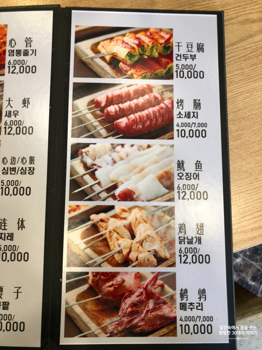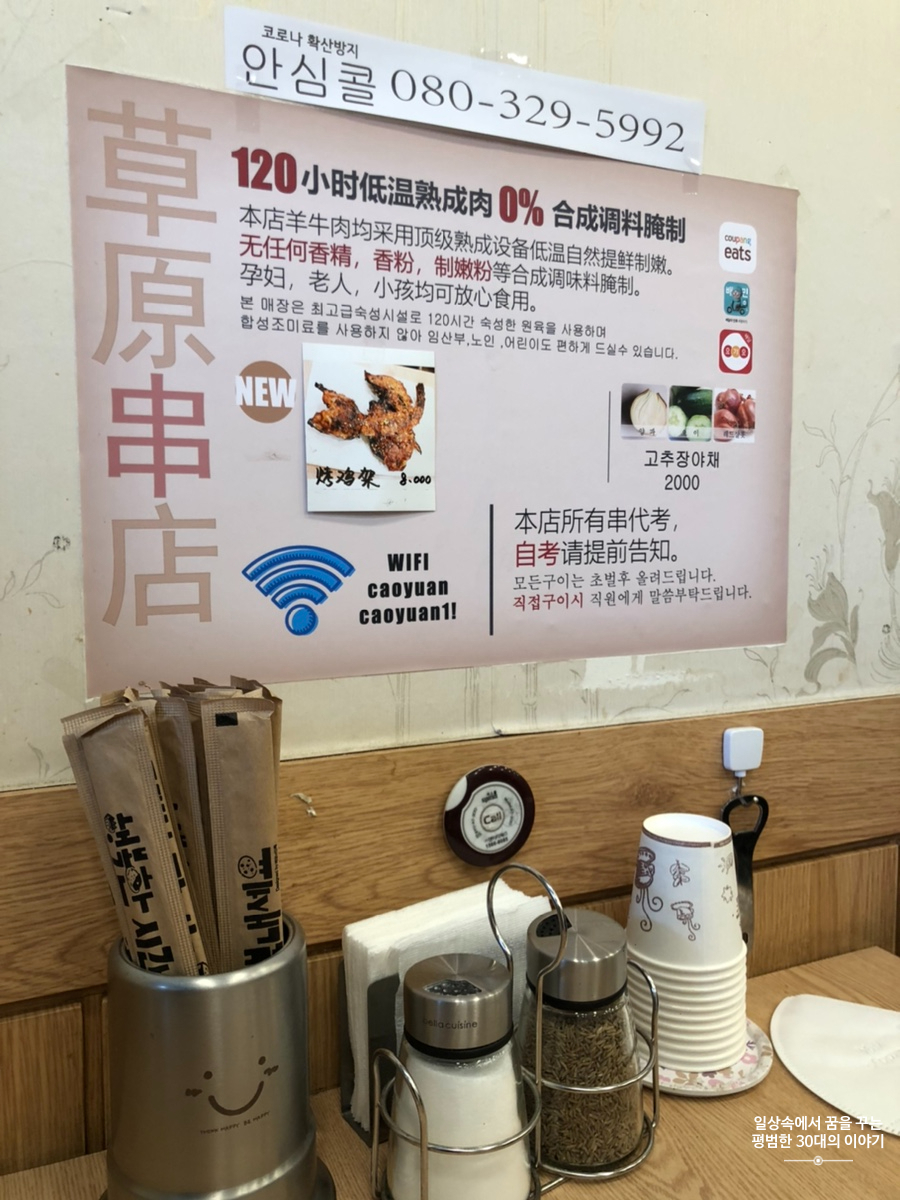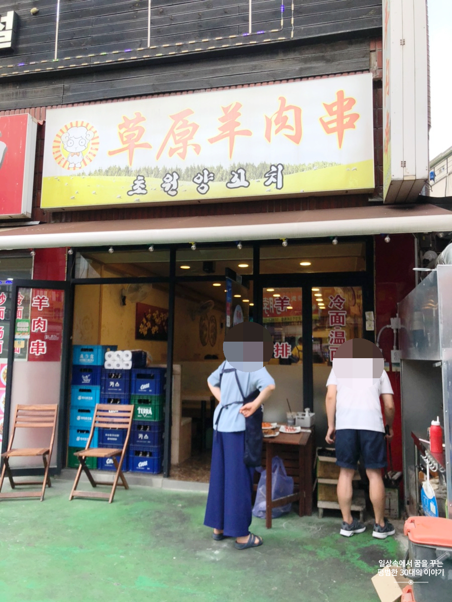 3월에 이사 온 집에서 대림역이 그다지 멀지 않기에 중국 식당이 무척 많은데 평일에는 거의 집에서 직접 요리를 해서 먹다 보니 갈 기회가 없었고 주말에라도 도장 깨기처럼 중국 식당을 하나씩 점령해 보기로! 이날은 우리의 최애 음식 중 하나인 양 꼬치를 먹기 위해 카카오 지도에서 우연치 않게 발견한 초원양꼬치에 갔다. 약간 이른 저녁 시간이었는데 이미 내부는 손님으로 붐볐는데 내부가 그다지 넓지는 않았다.