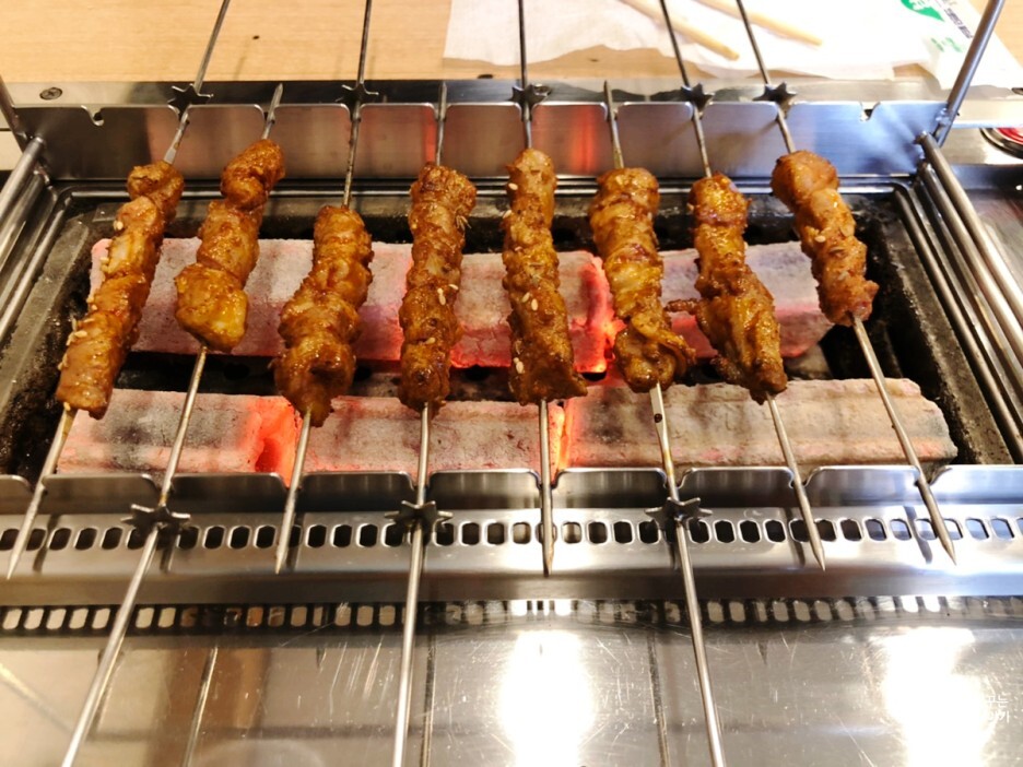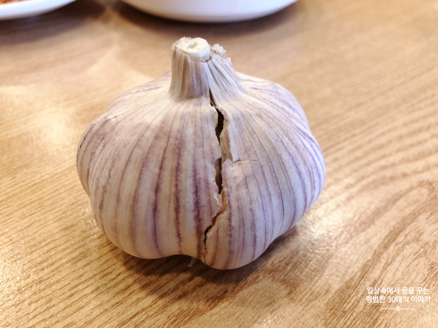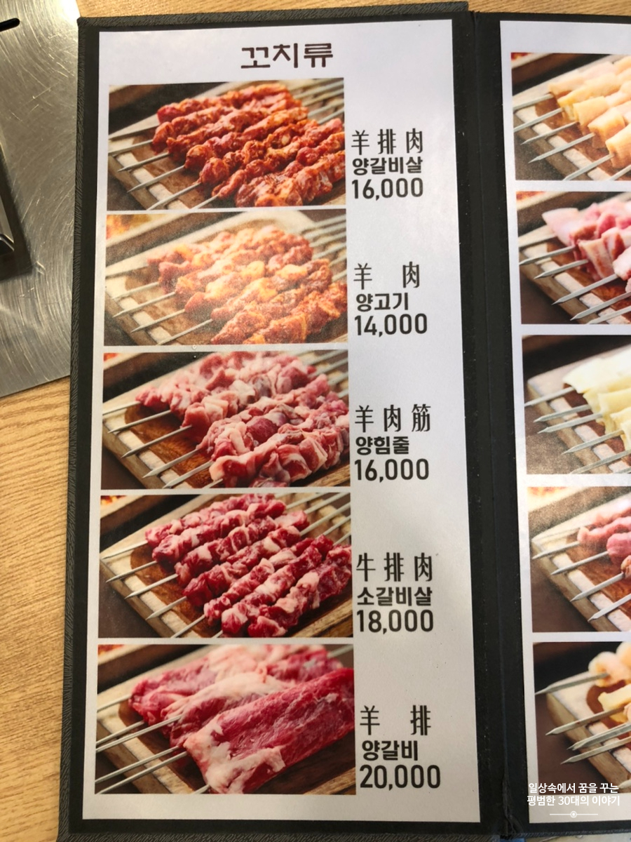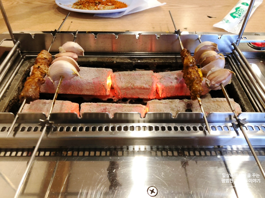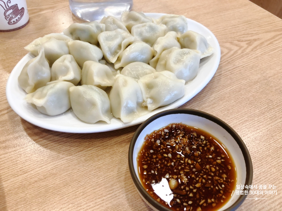 우리는 둘이서 양고기 2인분(1인분 14000원), 양갈비살 1인분(1인분 16000원) 그리고 물만두(7000원)를 주문했다. 여기는 다른 양 꼬치 집이랑 다르게 꼬치를 밖에서 초벌을 해서 가져다주기 때문에 먹을 때 살짝 더 익혀 먹기만 하면 돼서 편했고 통마늘을 직접 꼬치에 꽂아먹을 수 있도록 줬는데 고소하니 맛있더라. 그리고 벽에 붙어있는 안내문에 따르면 합성조미료를 사용하지 않는다고 해서 임산부인 나는 더 마음 편히 먹을 수 있었다. 양갈비살은 양고기보다 2000원이 더 비싼데 맛에서는 크게 차이가 없어 나중에 양고기만 1인분 더 추가했다. 양갈비살과 양고기 모두 어디 나무랄 데 없이 무척 맛있어서 양 꼬치가 먹고 싶을 때면 이곳을 종종 찾을 것 같다. 그리고 물만두는 중국식 물만두였는데 7000원에 생각보다 양이 무척 많아서 간신히 다 먹었다는... 직접 만든 건지 냉동만두인지는 모르겠지만 중국식 만두를 처음 먹어본 남편도 무척 만족해하며 젓가락을 놓지 않고 계속 집어먹었다. 몇몇 후기를 보니 온면도 맛있다고 하던데 다음에는 온면을 주문해 봐야겠다.