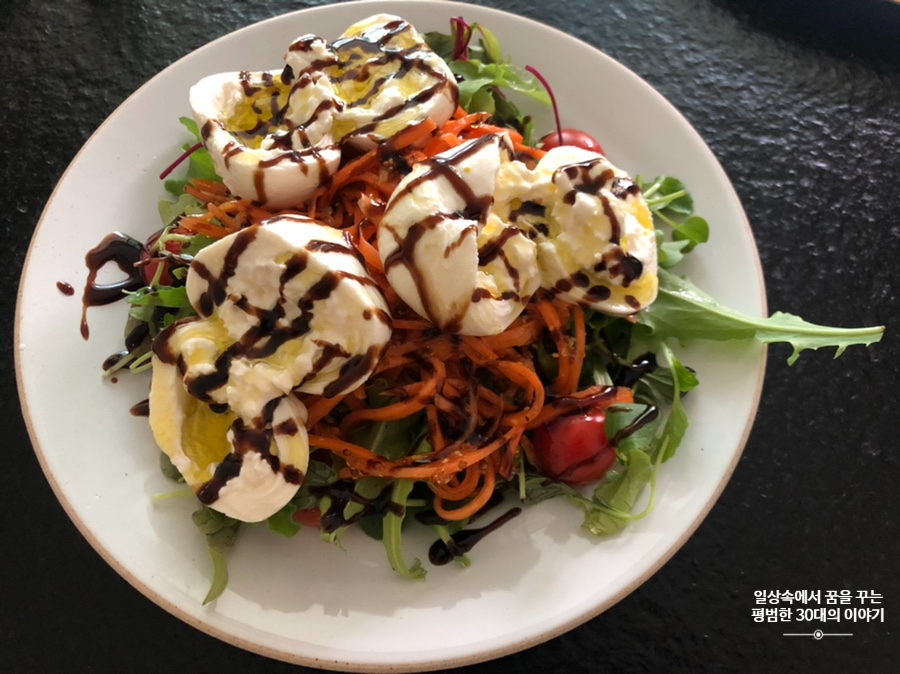 브라타치즈 샐러드 - 브라타치즈, 당근라페, 샐러드야채, 발사믹 소스, 올리브오일