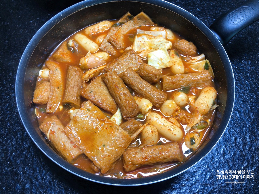 떡볶이 - 치즈떡, 어묵, 양배추, 양파, 다시다, 미원, 고추장, 고춧가루, 간장, 설탕, 대파