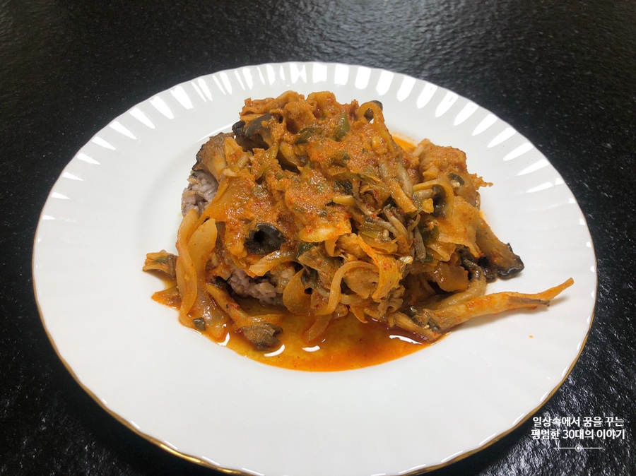 제육볶음 덮밥 - 대패삼겹살, 느타리버섯, 양파, 고추장, 고춧가루, 맛술, 간장, 다진마늘