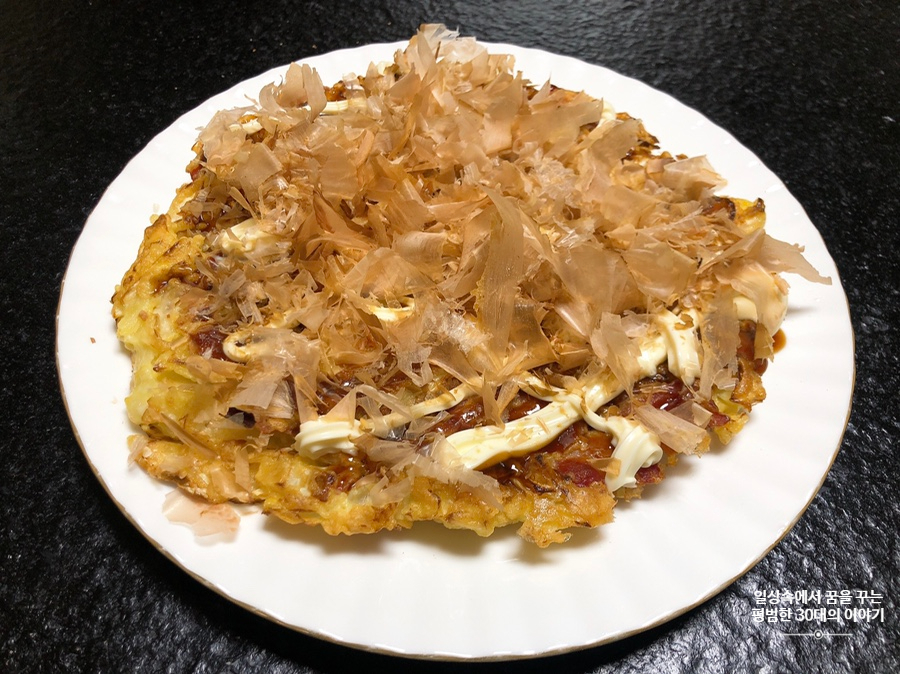 베이컨 오코노미야끼 - 베이컨, 양배추, 계란, 부침가루, 돈까스 소스, 마요네즈, 가쓰오부시가루