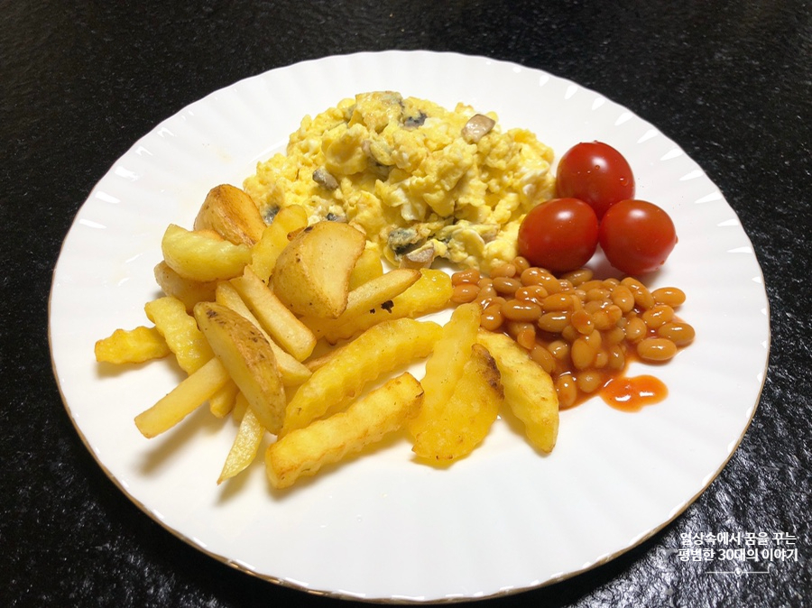 메뉴: 오믈렛, 감자튀김, 베이크드빈, 방울토마토