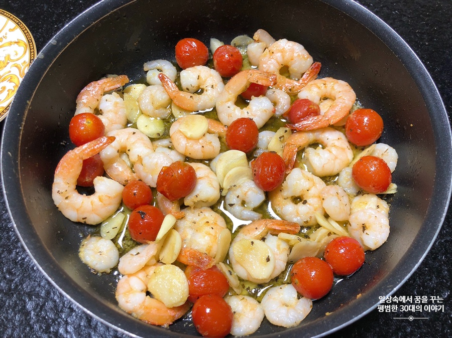감바스 - 새우, 방울토마토, 마늘, 다진마늘, 후추, 바질가루, 소금, 올리브오일