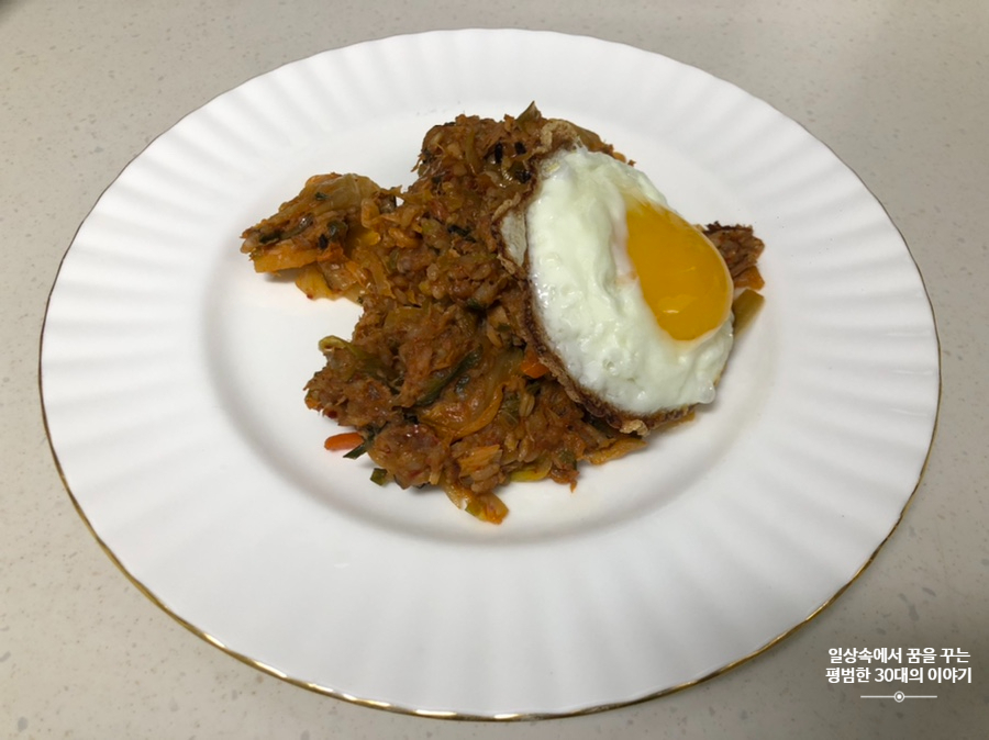참치김치볶음밥 - 밥, 참치, 김치, 참기름, 고춧가루, 간장, 계란, 설탕