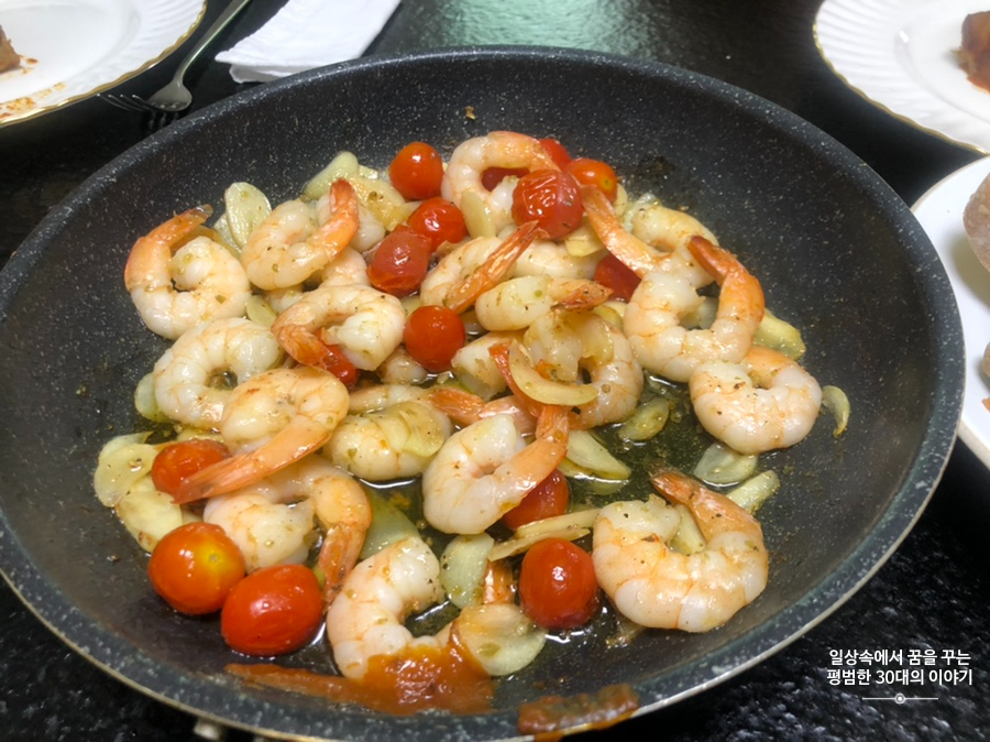 감바스 - 마늘, 새우, 방울토마토, 바질가루, 허브소금, 후추