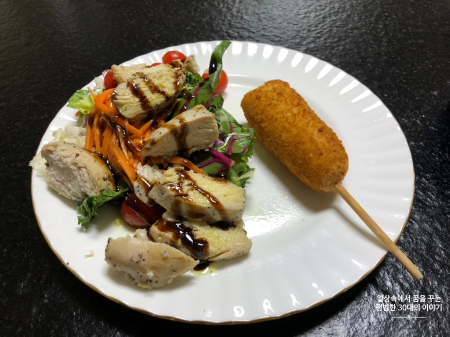 저녁: 닭가슴살 샐러드, 모짜렐라 핫도그 |