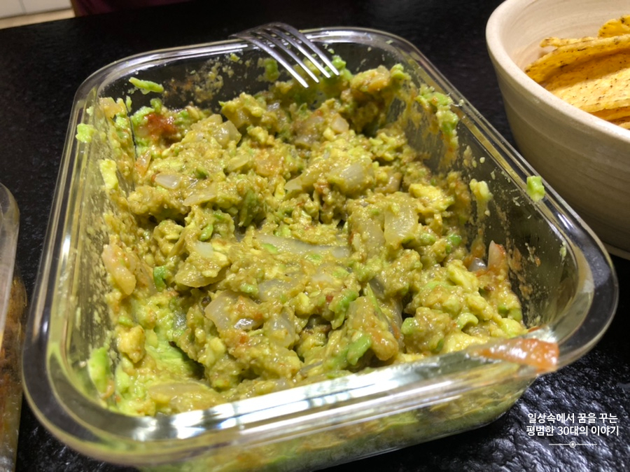 메뉴: 과카몰리, 나초, 지난주 주말에 먹고 남은 라자냐
