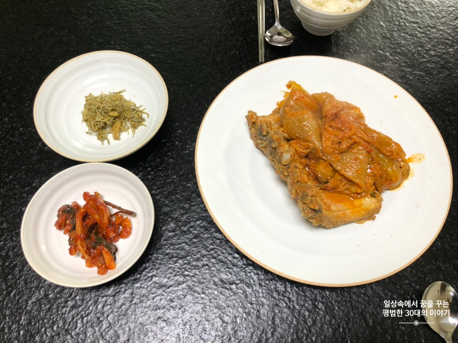 메뉴: 등갈비 김치찜, 멸치볶음, 무말랭이, 친구 아들용 볶음밥