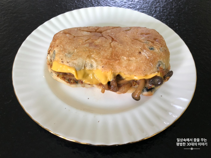 치아바타 불고기 샌드위치 - 느타리버섯, 양파, 불고기용 소고기, 불고기 소스, 치즈, 홀머스타드, 마요네즈, 치아바타