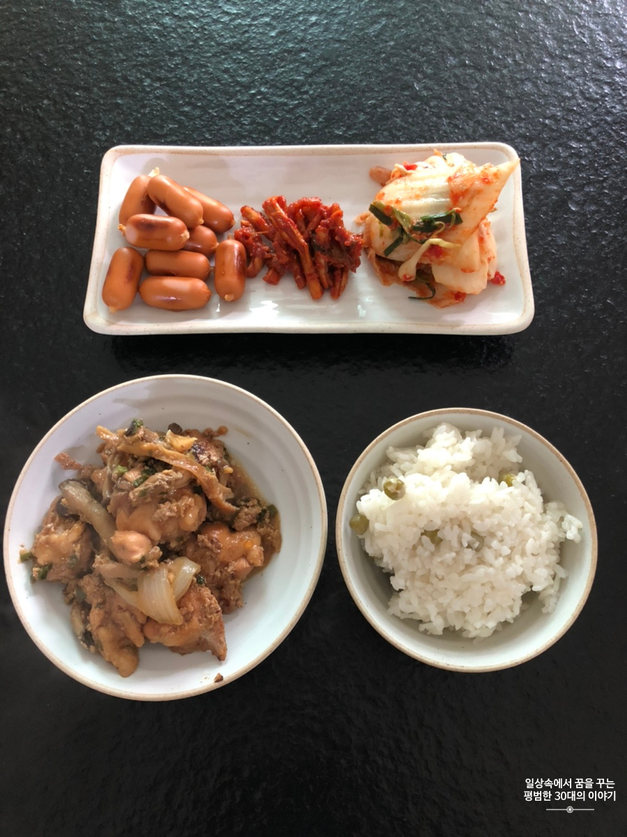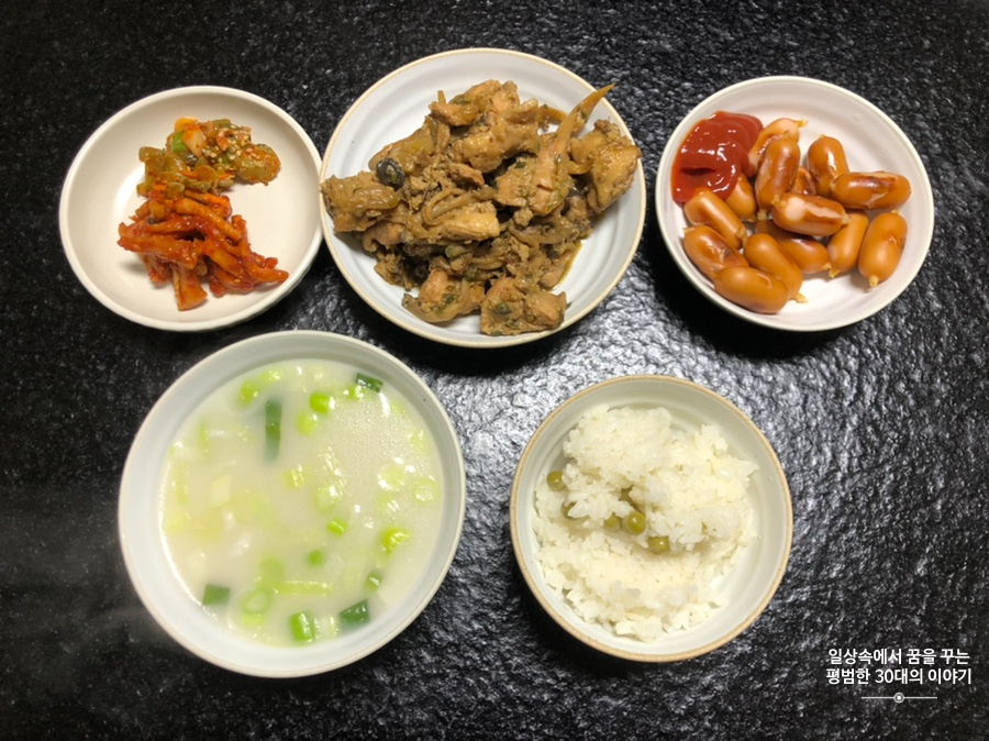 저녁: 비엔나 소세지, 무말랭이 무침, 오이지, 주말에 먹고 남은 간장 닭갈비, 곰국 |