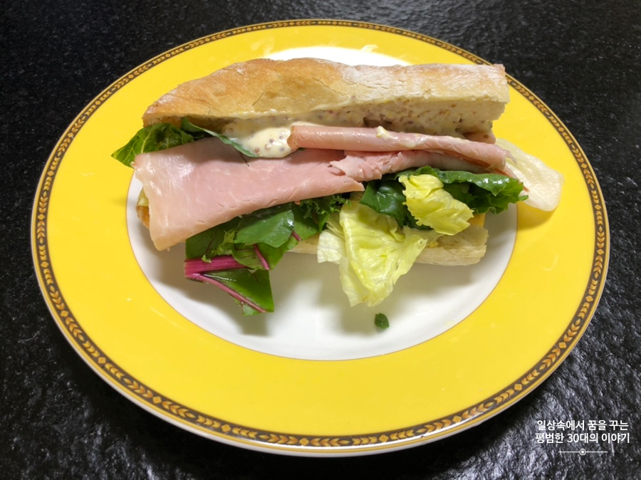 바게트 샌드위치 - 잠봉, 샐러드야채, 치즈, 바게트, 마요네즈, 홀머스터드, 라임즙, 꿀