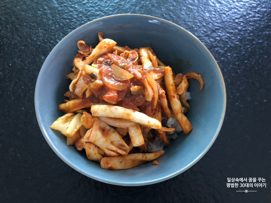 오징어 덮밥 - 오징어, 양파, 대파, 청양고추, 고춧가루, 참기름, 고추장, 간장, 설탕, 다진 마늘, 후추, 맛술