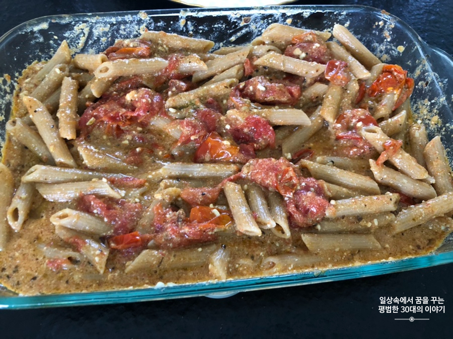 페타치즈 파스타 - 페타치즈, 호밀 파스타면, 방울토마토, 올리브오일, 소금, 바질 가루, 오레가노 가루, 꿀, 토마토 소스