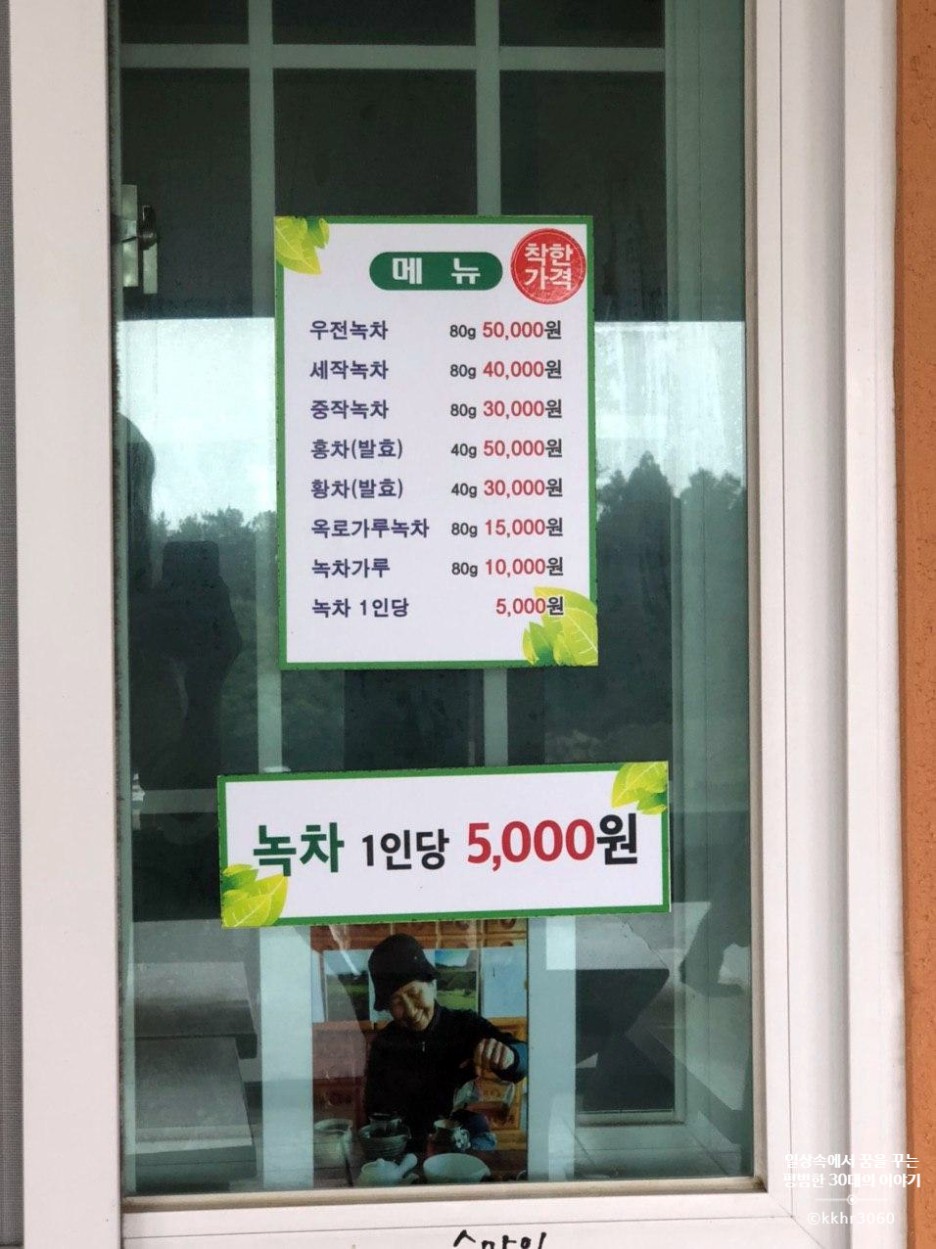 다실에 들어서면 따님이 자리를 안내해 주신다. 우리는 넓은 창으로 쭉 펼쳐진 푸르른 차밭을 볼 수 있는 명당자리에 앉았다. 아직 차를 마시지도 않았는데 힐링이 되는 기분이 들었다. 평화롭게 새소리가 들리고 창밖으로 푸르른 녹차밭이 펼쳐져 있고 단돈 5000원에 내가 좋아하는 차를 마실 수 있는 이런 곳이 세상 어디에 있을까. 1인당 5000원을 내면 녹차와 홍차 두 종류를 귤피 디저트와 함께 내어주신다. 귤피를 설탕에 절인 듯한데 생각보다 녹차와 잘 어울린다.
