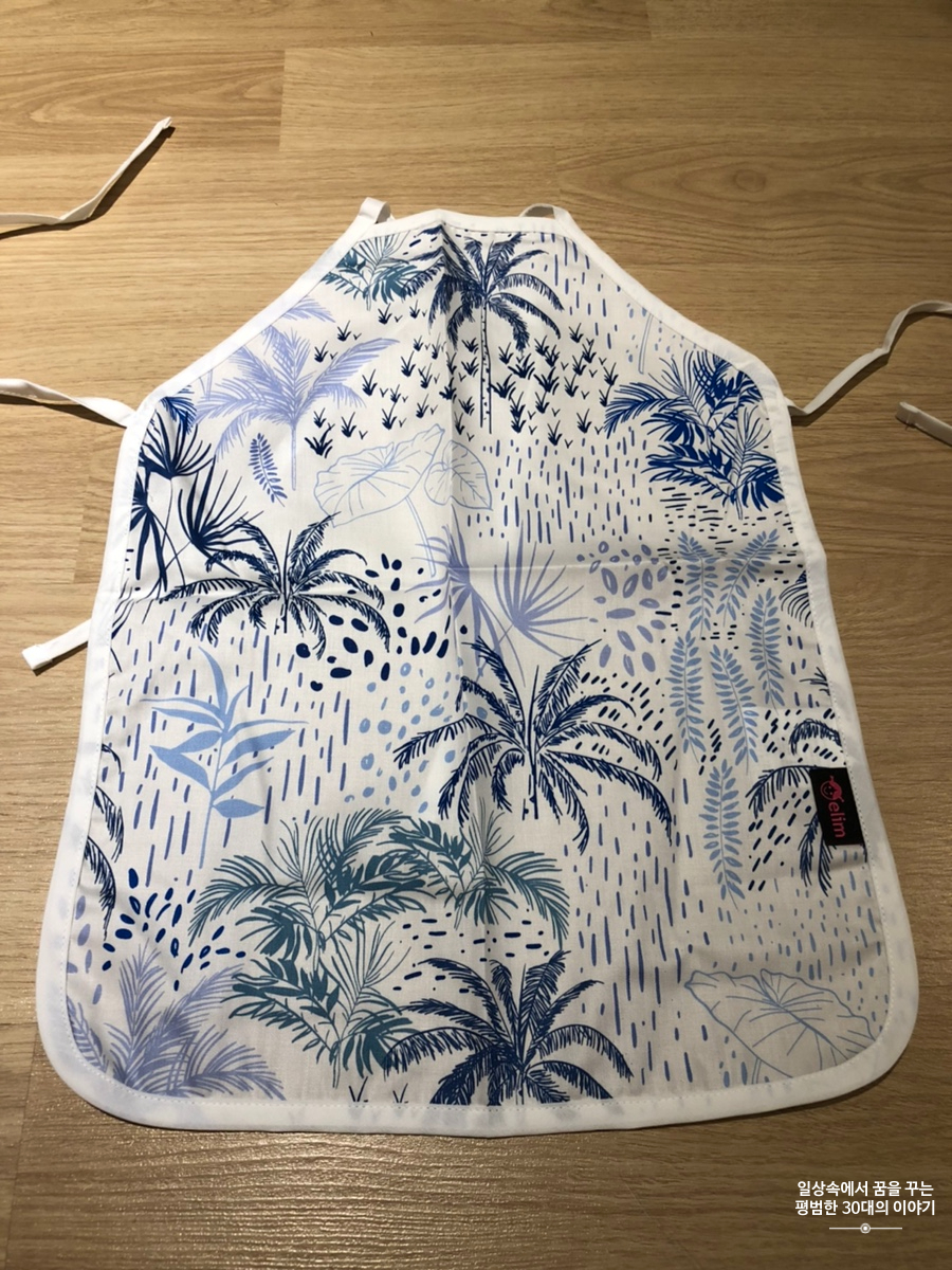 시원한 색상의 디자인에 엘림 유아용 앞치마는 사이즈가 너무 앙증맞다. 아기가 한 4~5살은 돼야 사용할 수 있지 않을까 싶어 고이 접어 서랍장에 보관 중! 방수가 되는 재질이고 박음질이 탄탄하게 되어 있어 아기들이 막 사용해도 찢어지거나 하지 않을 것 같아 보였다.