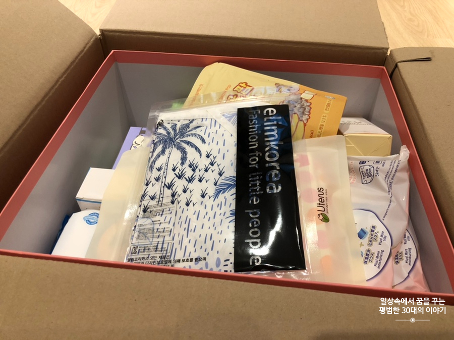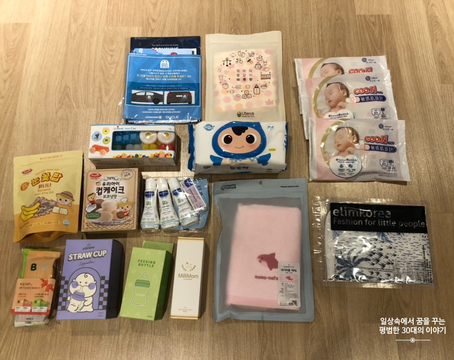 받자마자 안에 구성품을 바닥에 쭉 펼쳐놓고 사진을 찍는데 보는 내내 흐뭇하다! 구성품이 다양하고 유용한 제품뿐이라 아기 낳고 도움이 많이 될 것 같다.
