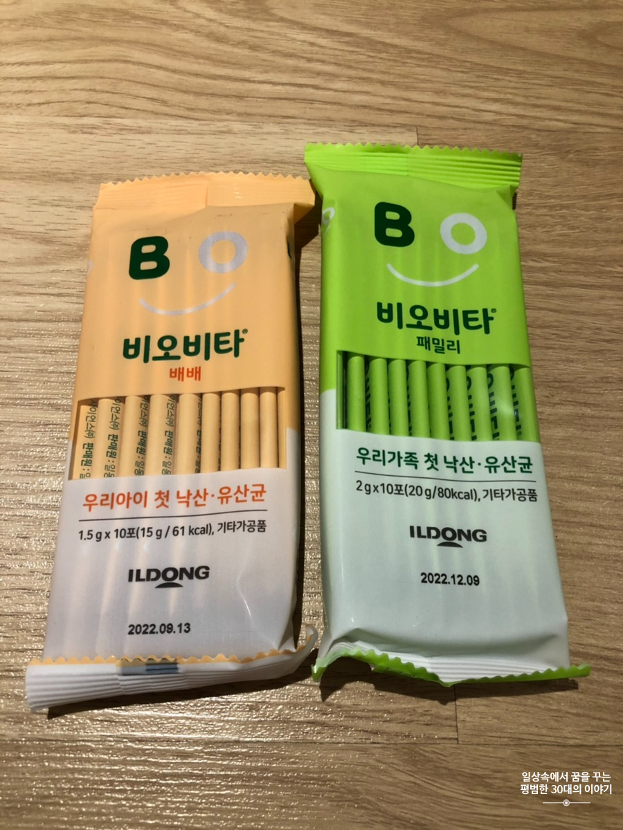 비오비타 샘플팩 2종(배배/패밀리) 중에 패밀리는 이미 내가 먹고 있다. 요즘 철분제 복용 때문에 변비가 와서 고생 중인데 유산균을 먹으면 좀 도움이 된다기에 받자마자 복용 중!