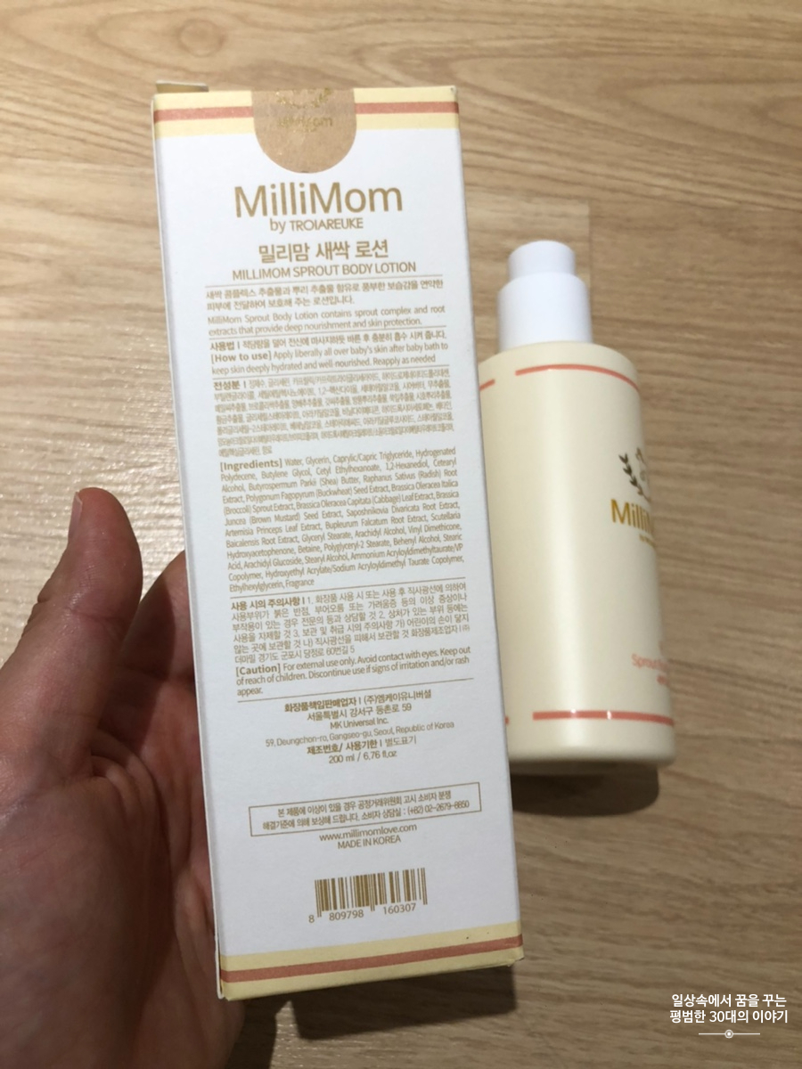 밀리맘 새싹 로션 200ml는 아직 사용해 보지는 안 않지만 성분을 확인해 보니 순한 편이더라. 밀리맘 새싹 워시도 있는데 아기가 태어나면 세트로 한 번 사용해 봐야겠다. 200ml 면 꽤 오랜 기간 사용할 수 있을 듯!