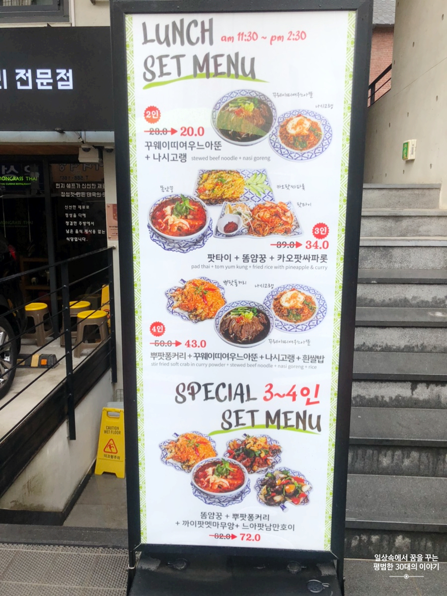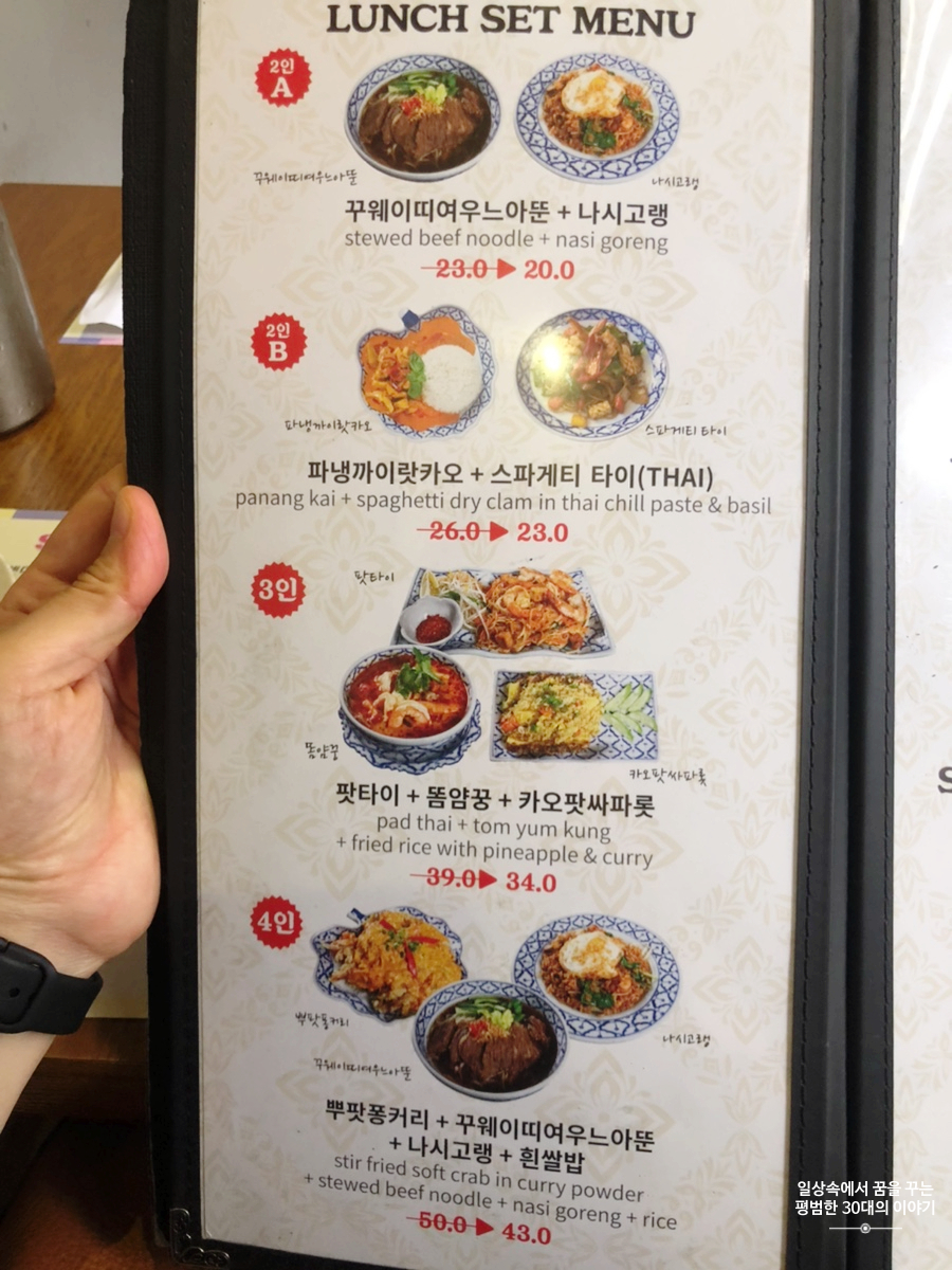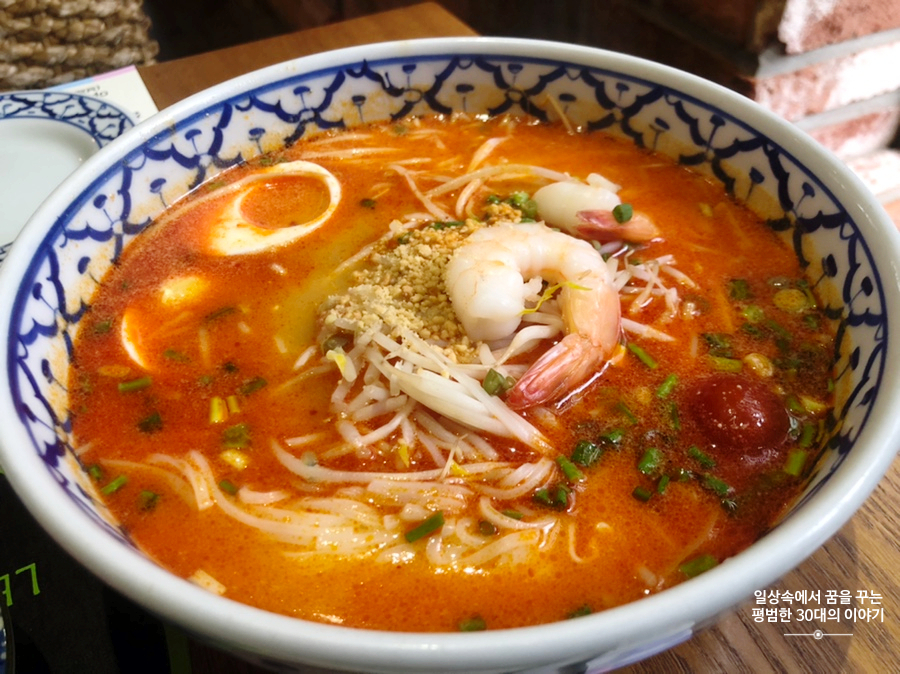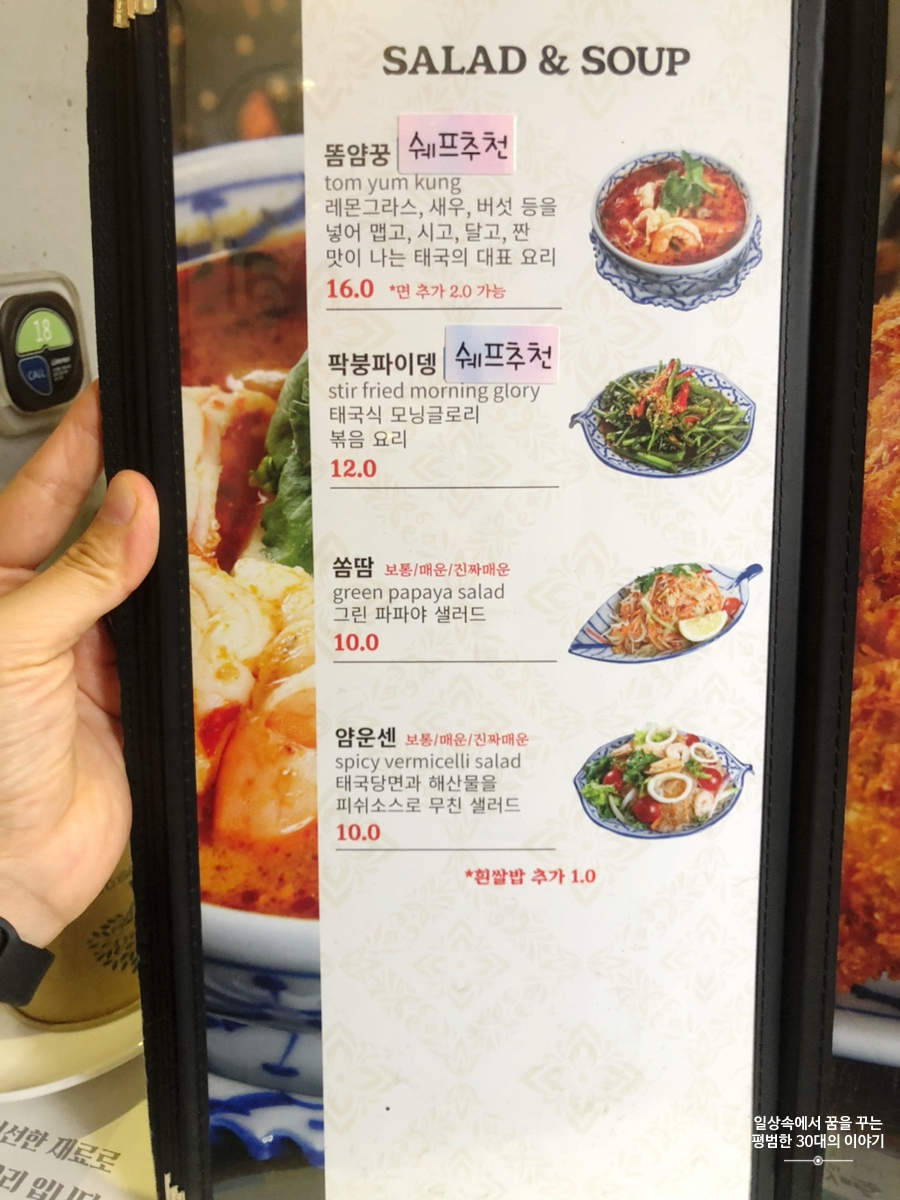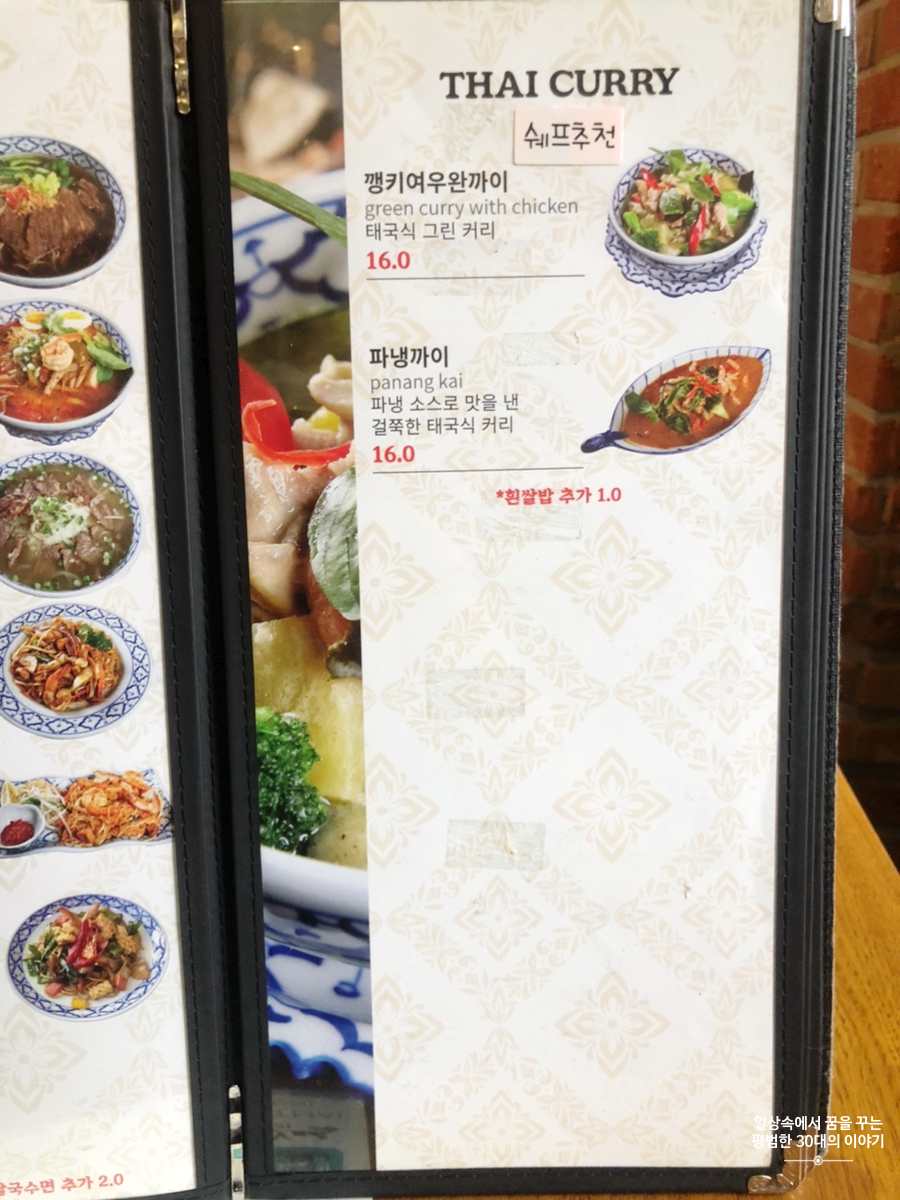 남동생은 보통 회사 동료들이랑 점심 식사하러 가면 세트메뉴를 주문한다는데 2인 세트 메뉴 중에 먹고 싶은 게 없어서 그냥 단품으로 주문했다. 우리는 둘이서 뿌팟퐁커리(15000원), 꾸웨이띠여우똠얌(13000원) 그리고 공깃밥(2000원)을 주문했다. 아직 손님이 많은 시간대가 아니라서 그런지 주문한지 5분 만에 나왔다. 사실 꾸웨이띠여우똠얌은 미리 만들어놨을 거라 생각해서 금방 나올 줄 알았고 뿌팟퐁커리는 요리하는데 시간이 좀 걸릴 줄 알았는데 5분 만에 나와서 당황했다;;; 뿌팟퐁커리는 기대했던 것보다는 살짝 아쉬웠고 꾸웨이띠여우똠얌은 기대했던 것보다 훨씬 맛있었다. 그래도 왜 그렇게 장사가 잘 되는지 이해되는 맛! 특히 꾸웨이띠여우똠얌은 내가 생각했던 똠얌꿍의 시큼하면서 칼칼한 매콤함이 느껴져서 면을 추가하고 싶었다. 뿌팟퐁커리는 물론 튀긴 소프트 크랩의 식감이 좋았지만 커리의 맛이 너무 약한 게 아닌가 싶어서 그 부분이 아쉬웠다. 그래도 전반적으로 만족했던 점심으로 웬만한 프랜차이즈 태국 음식점보다 훨씬 맛있었다. 그리고 생각보다 메뉴가 무척 다양해서 다음에는 다른 요리에 도전해 보고 싶었다. 동생아, 기다려 내가 또 놀러 갈게~
