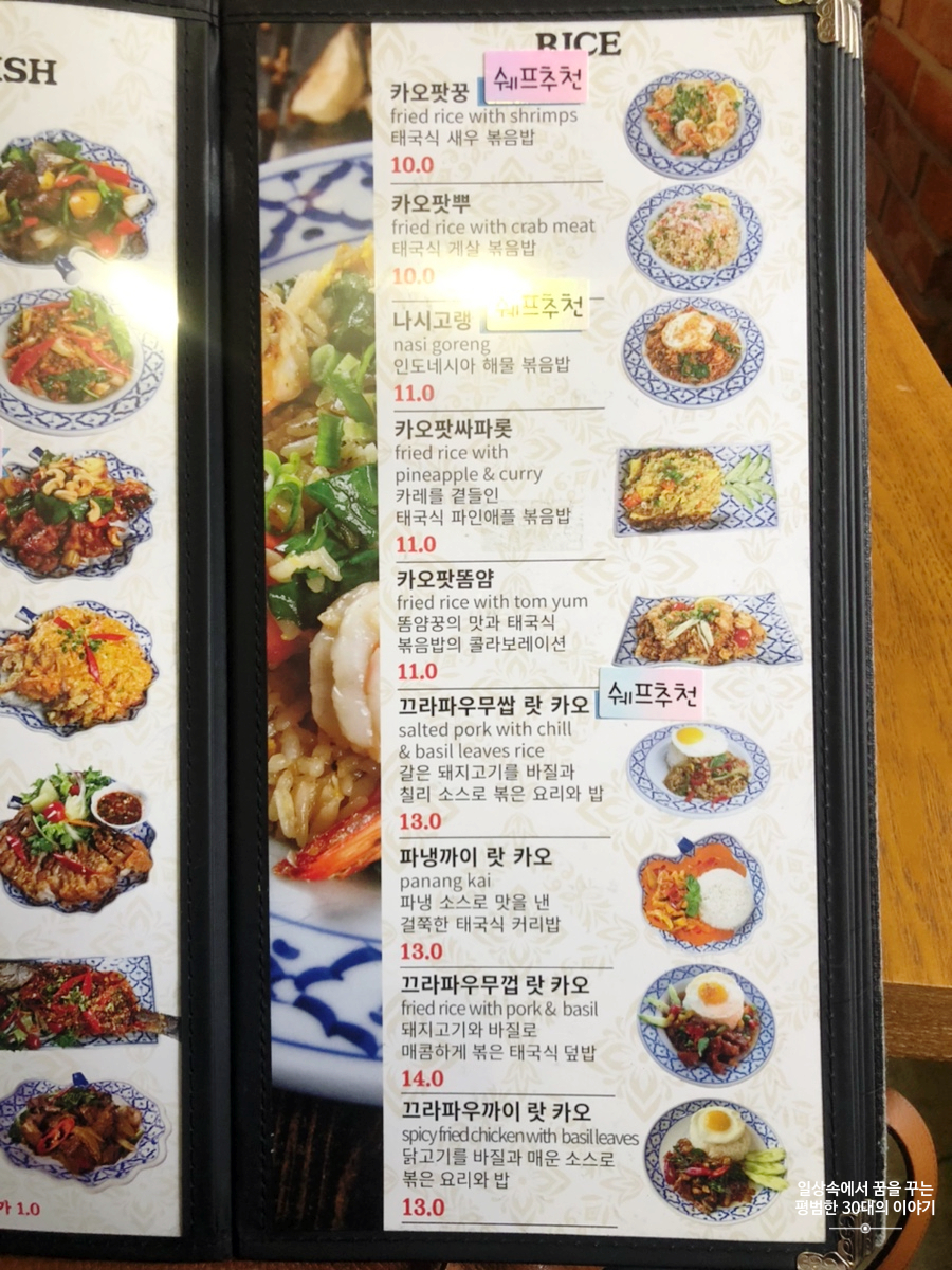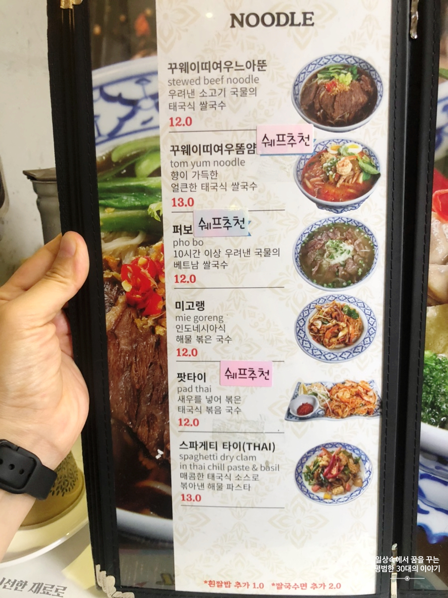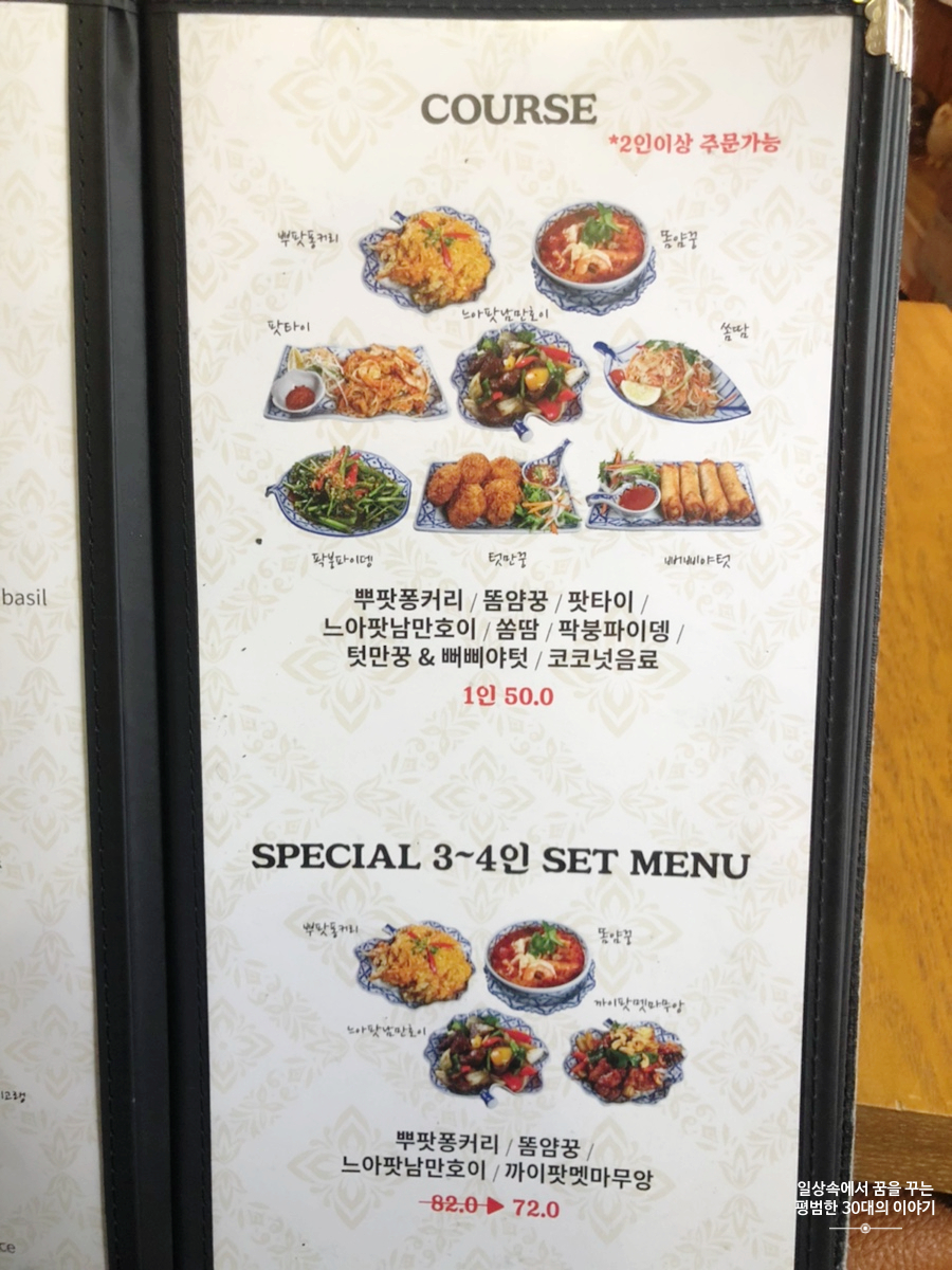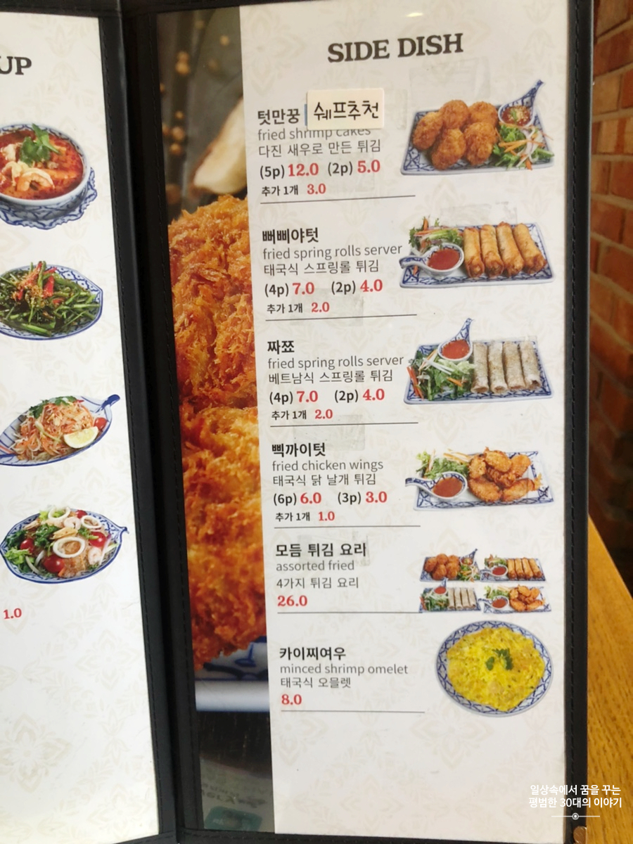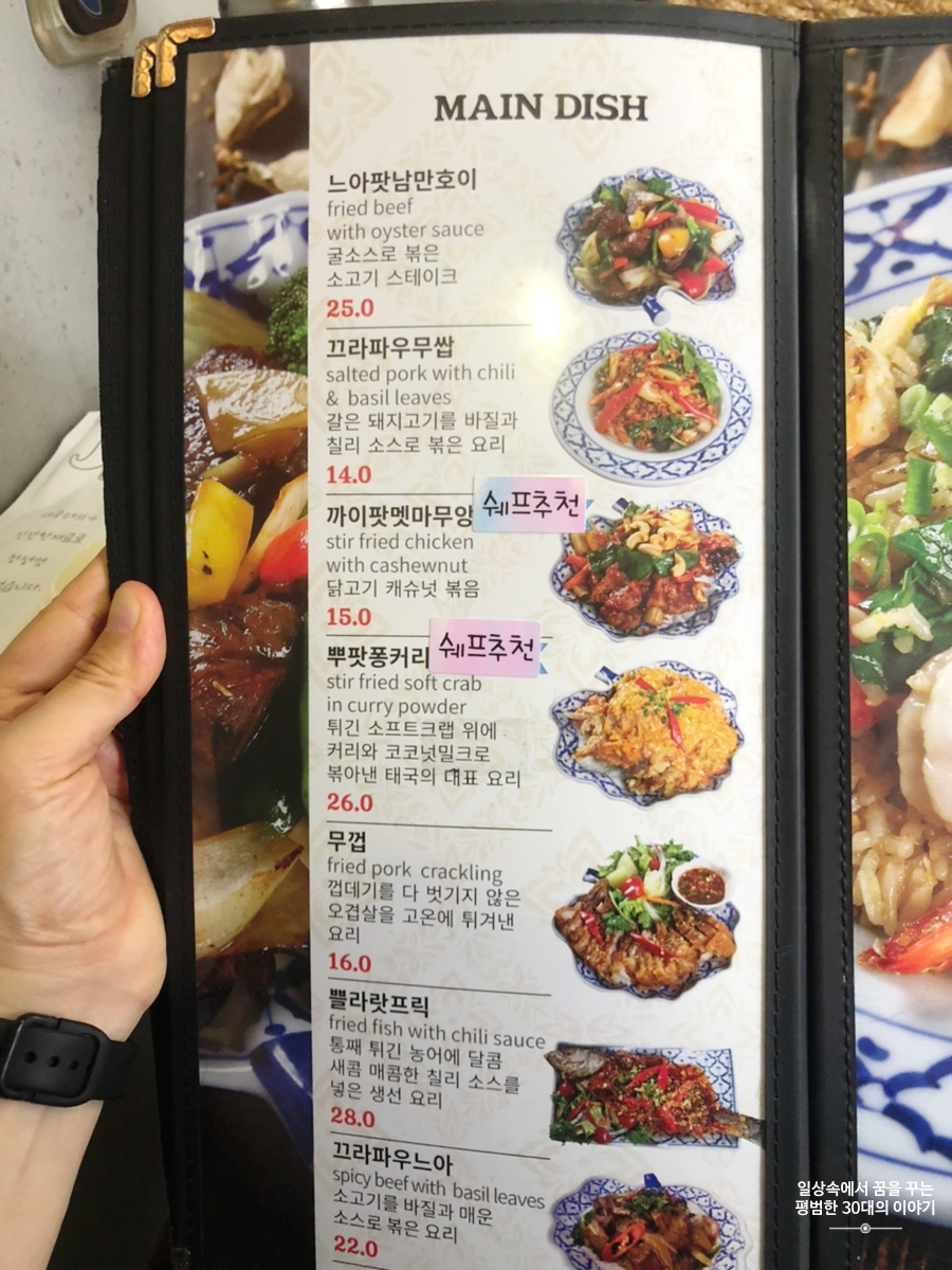 남동생은 보통 회사 동료들이랑 점심 식사하러 가면 세트메뉴를 주문한다는데 2인 세트 메뉴 중에 먹고 싶은 게 없어서 그냥 단품으로 주문했다. 우리는 둘이서 뿌팟퐁커리(15000원), 꾸웨이띠여우똠얌(13000원) 그리고 공깃밥(2000원)을 주문했다. 아직 손님이 많은 시간대가 아니라서 그런지 주문한지 5분 만에 나왔다. 사실 꾸웨이띠여우똠얌은 미리 만들어놨을 거라 생각해서 금방 나올 줄 알았고 뿌팟퐁커리는 요리하는데 시간이 좀 걸릴 줄 알았는데 5분 만에 나와서 당황했다;;; 뿌팟퐁커리는 기대했던 것보다는 살짝 아쉬웠고 꾸웨이띠여우똠얌은 기대했던 것보다 훨씬 맛있었다. 그래도 왜 그렇게 장사가 잘 되는지 이해되는 맛! 특히 꾸웨이띠여우똠얌은 내가 생각했던 똠얌꿍의 시큼하면서 칼칼한 매콤함이 느껴져서 면을 추가하고 싶었다. 뿌팟퐁커리는 물론 튀긴 소프트 크랩의 식감이 좋았지만 커리의 맛이 너무 약한 게 아닌가 싶어서 그 부분이 아쉬웠다. 그래도 전반적으로 만족했던 점심으로 웬만한 프랜차이즈 태국 음식점보다 훨씬 맛있었다. 그리고 생각보다 메뉴가 무척 다양해서 다음에는 다른 요리에 도전해 보고 싶었다. 동생아, 기다려 내가 또 놀러 갈게~